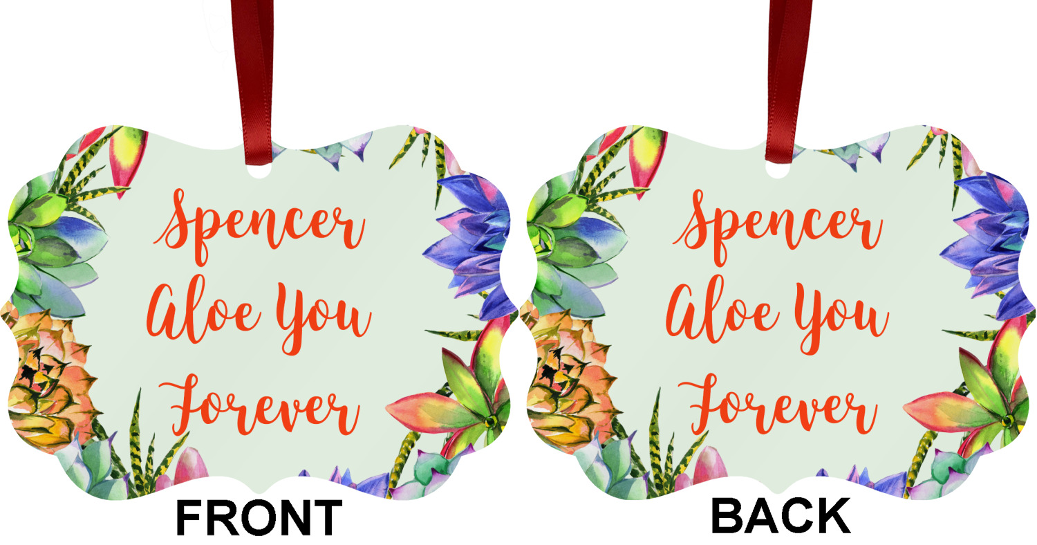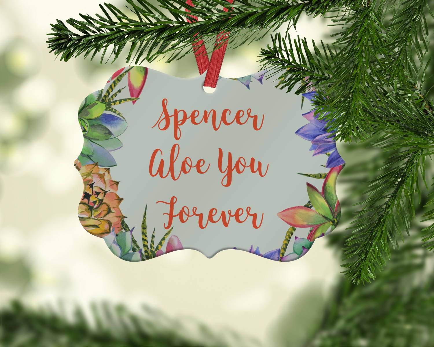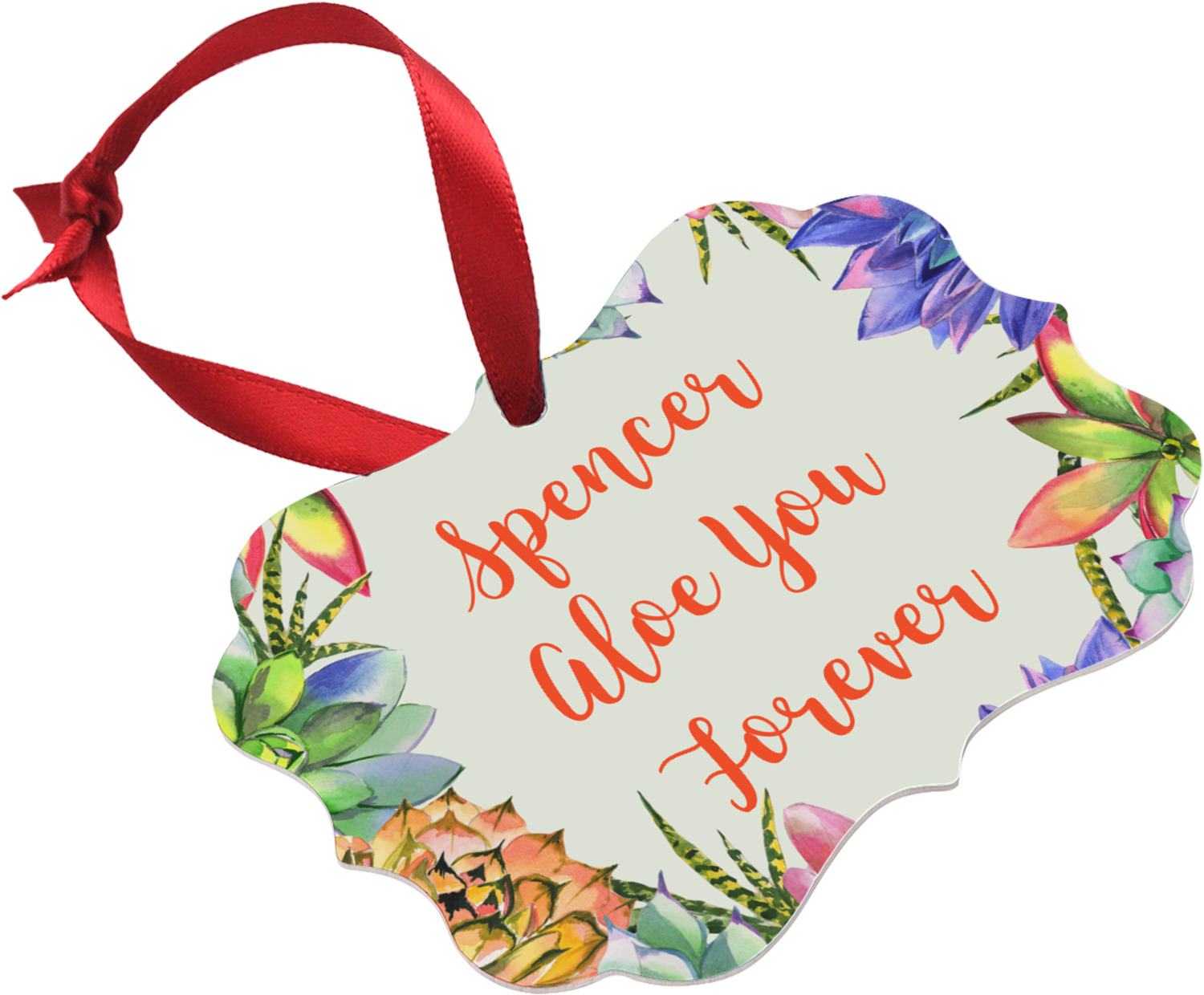 This design is made up of a beautiful frame of succulent illustrations. Because of the nature of the frame, this design will look different on every product. The background is a calming light green. The middle text says "Spencer, Aloe You Forever", which can easily be personalized to your own name or someone else's. You will find orange, green, purple, pink, and orange in this lovely design.