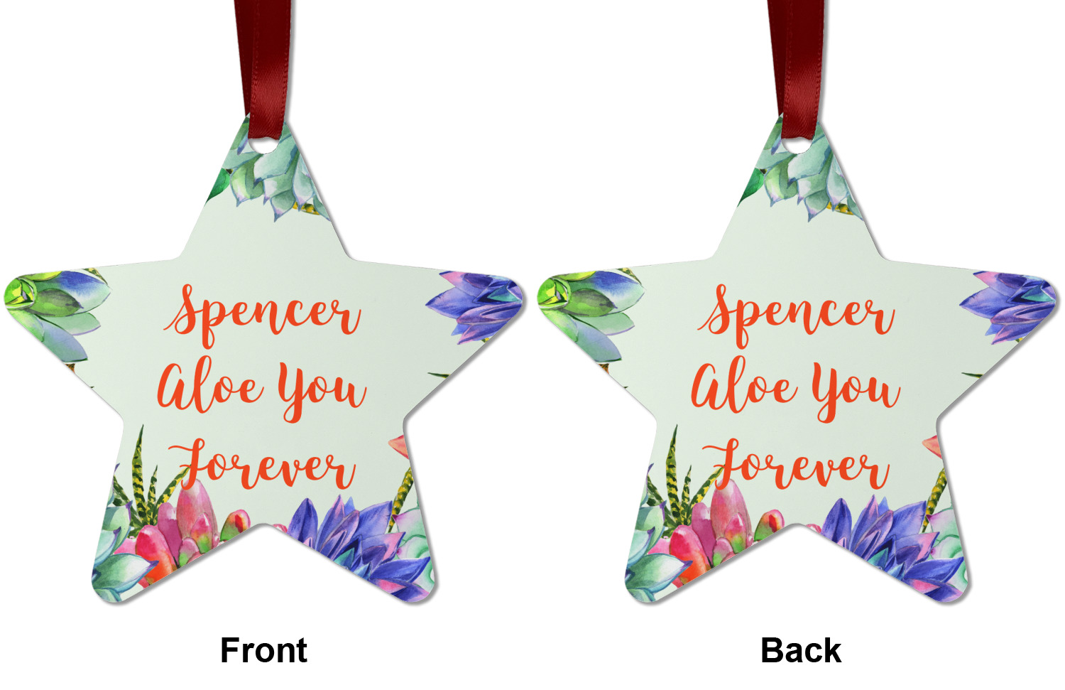 This design is made up of a beautiful frame of succulent illustrations. Because of the nature of the frame, this design will look different on every product. The background is a calming light green. The middle text says "Spencer, Aloe You Forever", which can easily be personalized to your own name or someone else's. You will find orange, green, purple, pink, and orange in this lovely design.