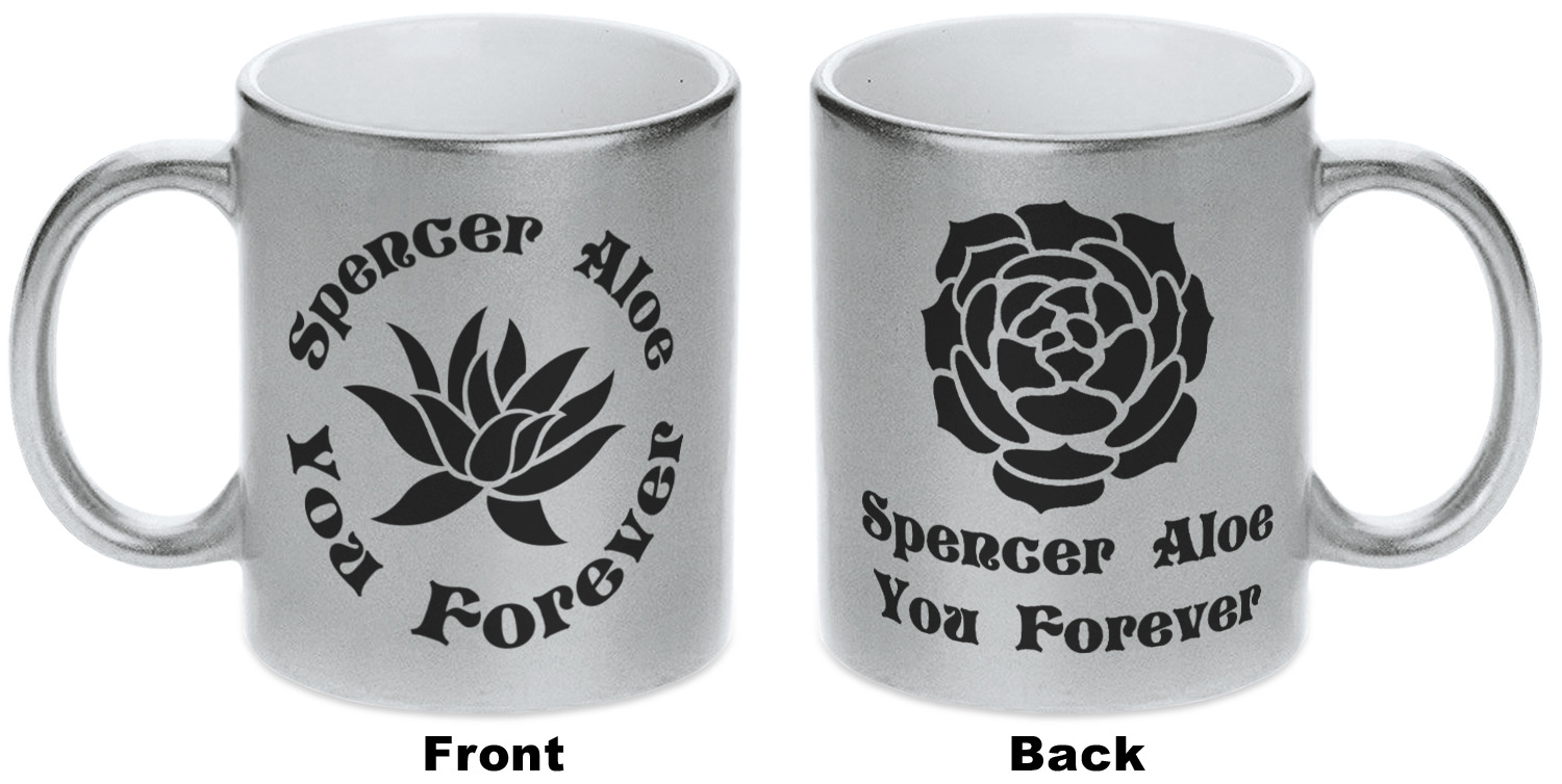 Our custom mugs are ceramic, which is great for keeping your tea or coffee warm! We offer two metallic mugs to personalize - Silver or Gold. Both styles hold around 11oz and have dimensions of approximately 3.75" x 3.5" x 4.75". Both the metallic mugs come in a matte finish and have glitter detailing to add a more pristine feel to the gold and silver base colors.