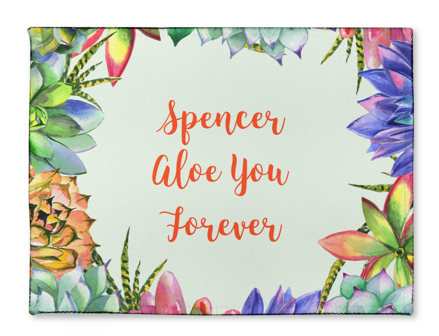 This design is made up of a beautiful frame of succulent illustrations. Because of the nature of the frame, this design will look different on every product. The background is a calming light green. The middle text says "Spencer, Aloe You Forever", which can easily be personalized to your own name or someone else's. You will find orange, green, purple, pink, and orange in this lovely design.