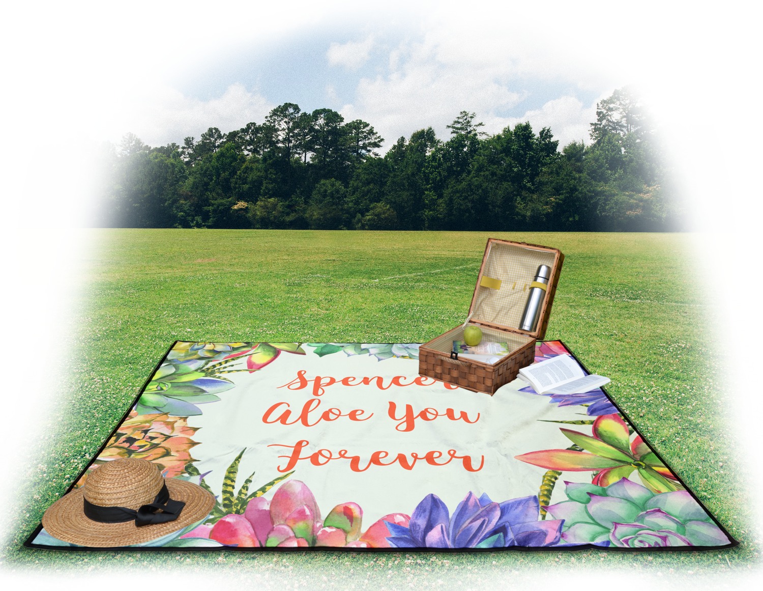 This picnic blanket is perfect for hanging out with your friends at the park or anywhere outside. The top of the blanket is made of a super soft microfiber fleece. The bottom of the blanket is made of a black material similar to a rain jacket and is water repellent as well. This will keep any wet spots on the ground from soaking through your picnic blanket. No one likes a wet blanket. The blanket measures at approximately 50" x 59" and has a nicely finished ribbon edge.