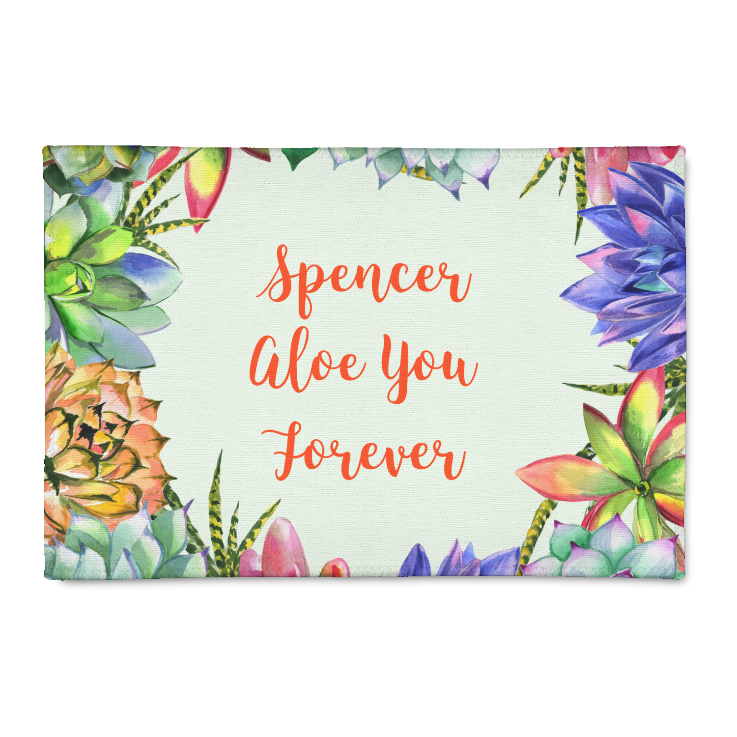 This design is made up of a beautiful frame of succulent illustrations. Because of the nature of the frame, this design will look different on every product. The background is a calming light green. The middle text says "Spencer, Aloe You Forever", which can easily be personalized to your own name or someone else's. You will find orange, green, purple, pink, and orange in this lovely design.