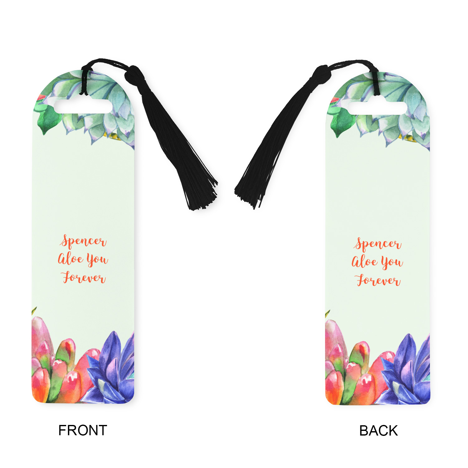 Made from a durable, flexible plastic, these bookmarks are printed with your custom design on them. With the tassel on them they make it easy to find your page in your book. These are a rectangular shape 7 1/4 inches tall with a rounded top and are approximately 2 1/4 inches wide.