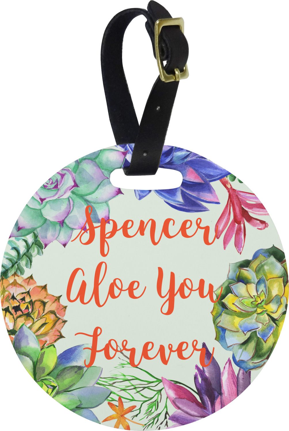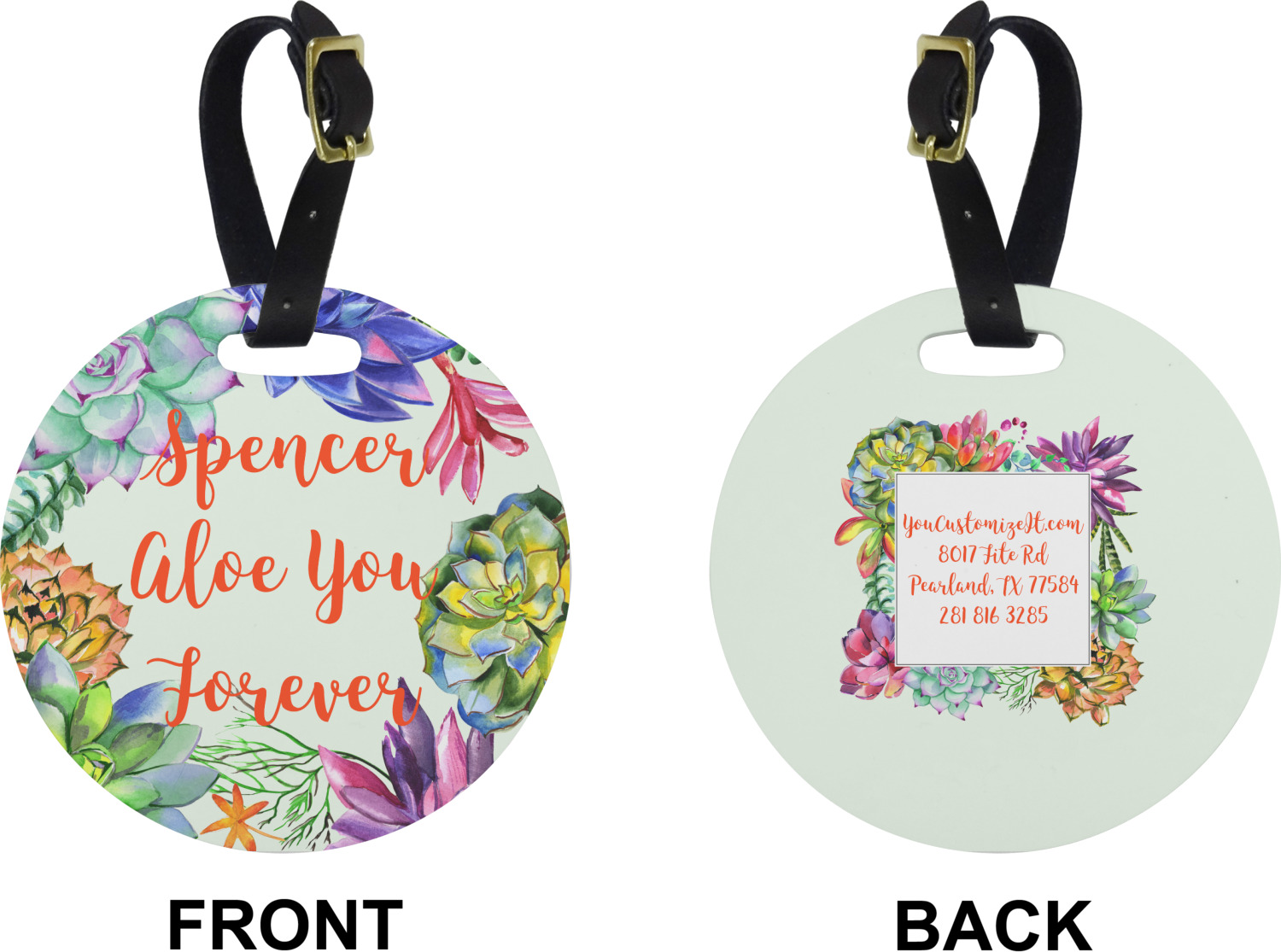 These personalized bag tags are sold in a variety of shapes, so that you may find the product that meets your vision exactly. We sell a round luggage tag, which measures at approximately 4" x 4". Our square luggage tag is about 3.5" x 3.5", while our rectangular version is 2.75" x 4 ".