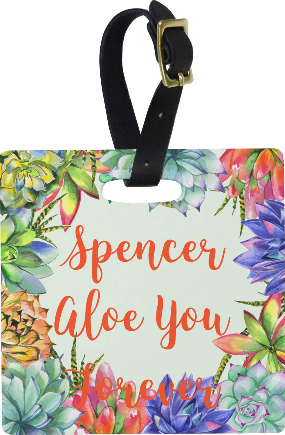 These personalized bag tags are sold in a variety of shapes, so that you may find the product that meets your vision exactly. We sell a round luggage tag, which measures at approximately 4" x 4". Our square luggage tag is about 3.5" x 3.5", while our rectangular version is 2.75" x 4 ".
