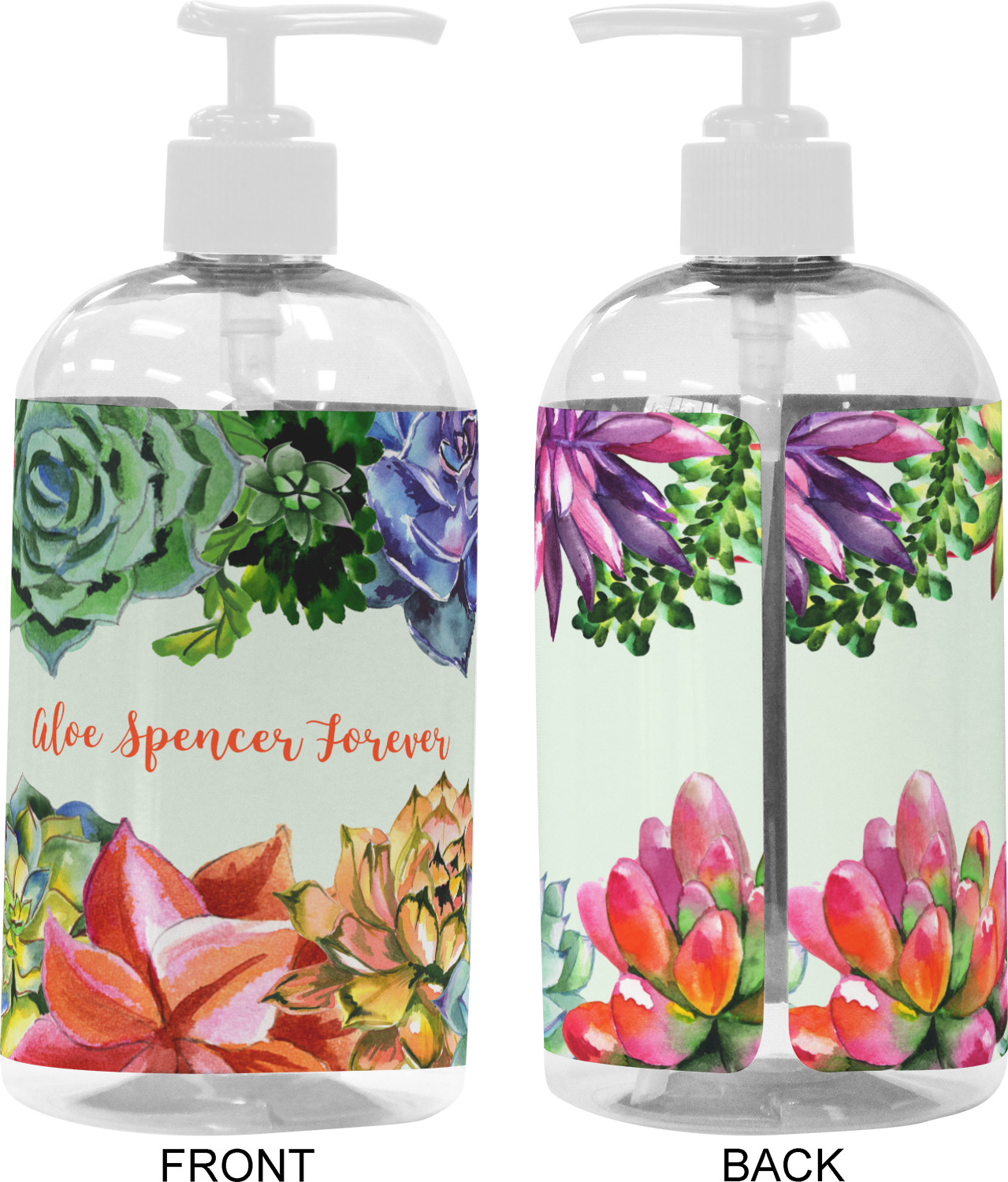 We adhere and wrap your custom printed design around the clear plastic bottle; there is a slight gap at the back for you to see the liquid level. Your design is printed on high gloss vinyl with eco-solvent inks and completely waterproof and will not fade or deteriorate over time. The vinyl is machine cut and adhered by hand to the clear plastic bottle.