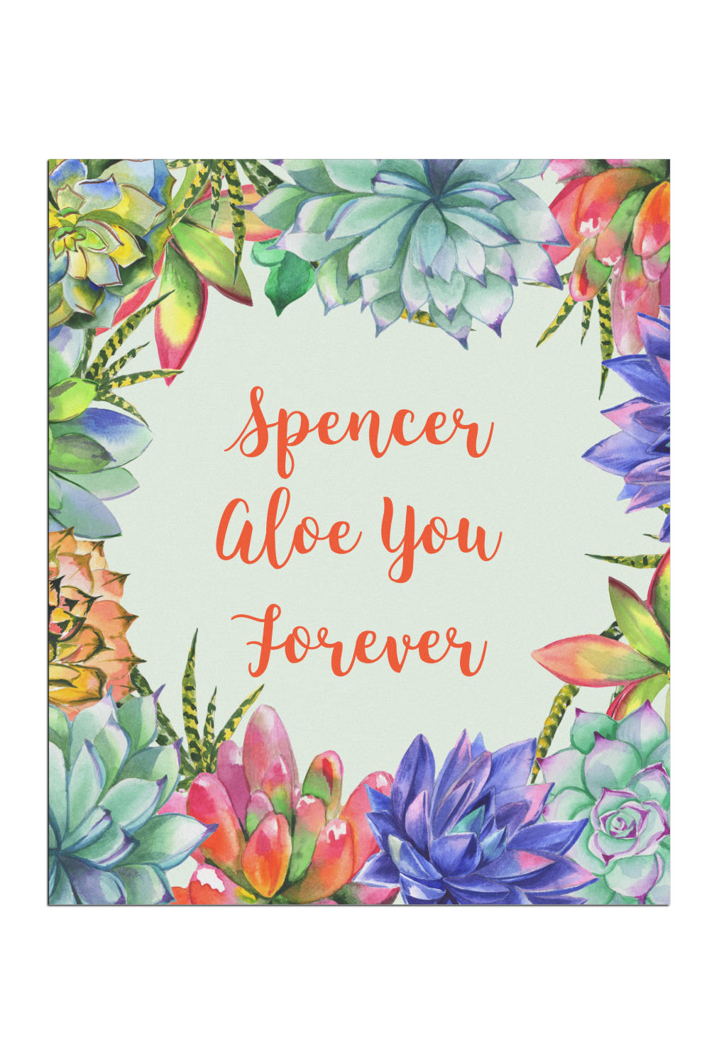 This design is made up of a beautiful frame of succulent illustrations. Because of the nature of the frame, this design will look different on every product. The background is a calming light green. The middle text says "Spencer, Aloe You Forever", which can easily be personalized to your own name or someone else's. You will find orange, green, purple, pink, and orange in this lovely design.