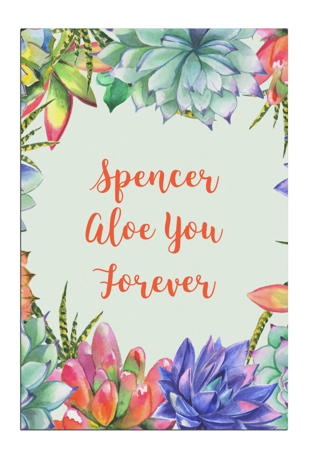 This design is made up of a beautiful frame of succulent illustrations. Because of the nature of the frame, this design will look different on every product. The background is a calming light green. The middle text says "Spencer, Aloe You Forever", which can easily be personalized to your own name or someone else's. You will find orange, green, purple, pink, and orange in this lovely design.
