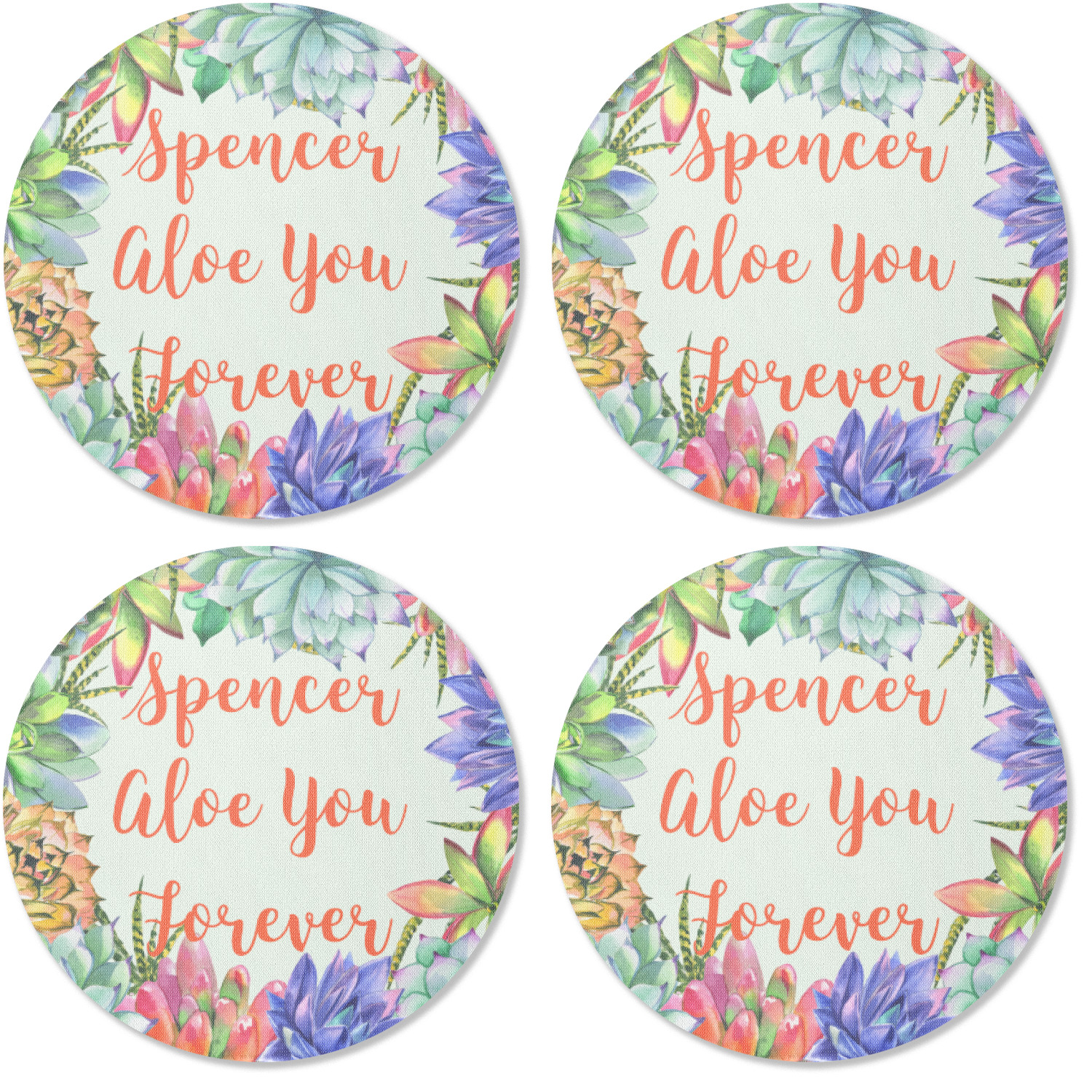 This design is made up of a beautiful frame of succulent illustrations. Because of the nature of the frame, this design will look different on every product. The background is a calming light green. The middle text says "Spencer, Aloe You Forever", which can easily be personalized to your own name or someone else's. You will find orange, green, purple, pink, and orange in this lovely design.