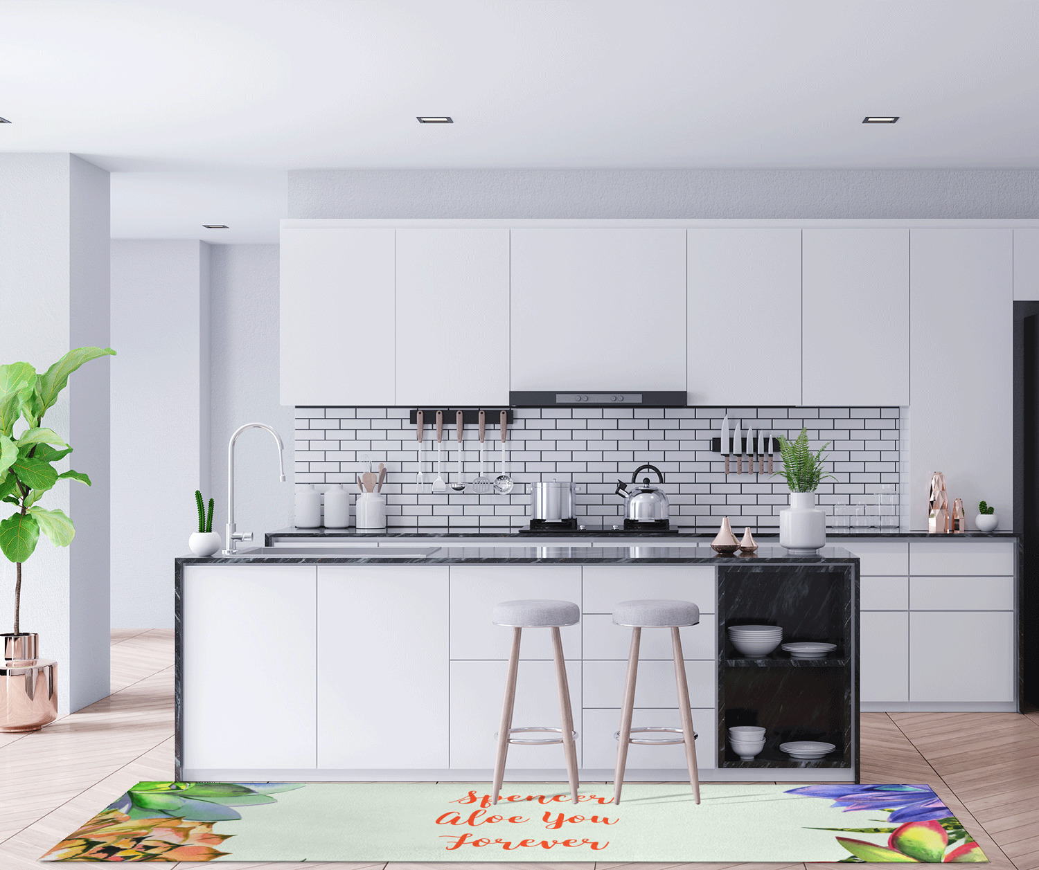 If you want to design it for your hallway - a vertical design is the perfect fit. If designing for to go in front of your kitchen island a horizontal design would suit you best! In our design system you can rotate the design either way to get the product you want.