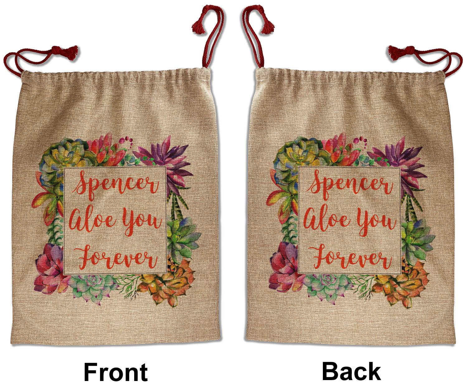 Our Santa sacks print your design on the burlap material giving it a nice rustic, natural design! The burlap material is also machine washable and wrinkle-free, so feel free to fold and store out Santa bags until the next time you need it! Secure your gifts with our red accent drawstring ties at the top of the sack so the mystery of your gift stays a surprise until Christmas day. We offer two types of printing- one side partial print or double-sided partial printing. Design and personalize your own Santa sack in time for the holidays!