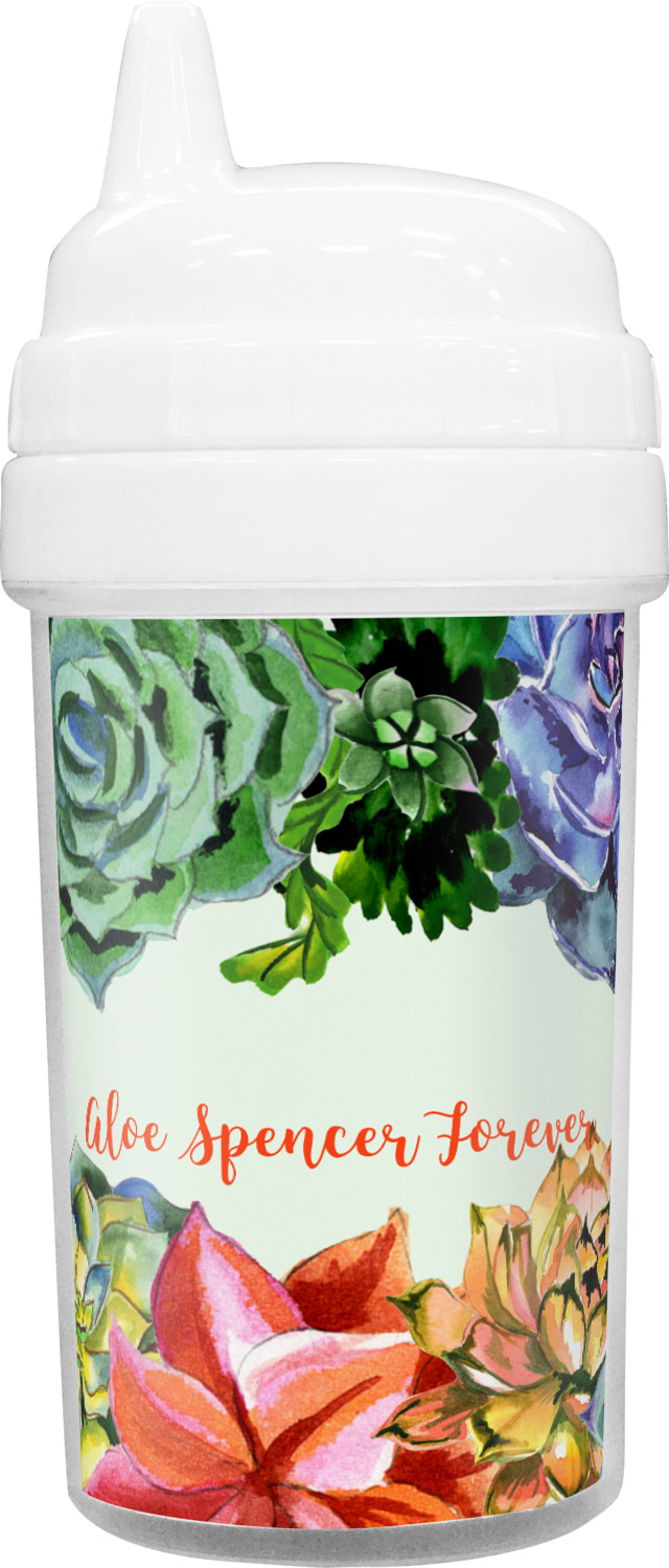 Our toddler cups are free of BPA, and have a twist-open lid so that you can easily fill and clean these cups for your young ones. Each cup also comes with a sippy nozzle to reduce spills. We offer these custom sippy cups in two different sizes; we have a baby sippy cup that holds 5 ounces, and a toddler sippy cup that holds 10 ounces. Your customization is printed on a premium glossy media insert that is placed within these toddler drinking cups.