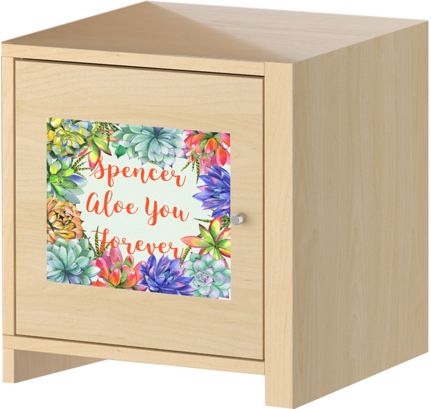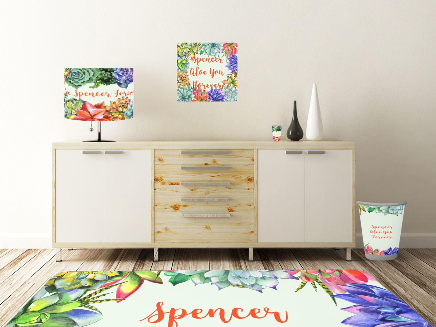 This design is made up of a beautiful frame of succulent illustrations. Because of the nature of the frame, this design will look different on every product. The background is a calming light green. The middle text says "Spencer, Aloe You Forever", which can easily be personalized to your own name or someone else's. You will find orange, green, purple, pink, and orange in this lovely design.