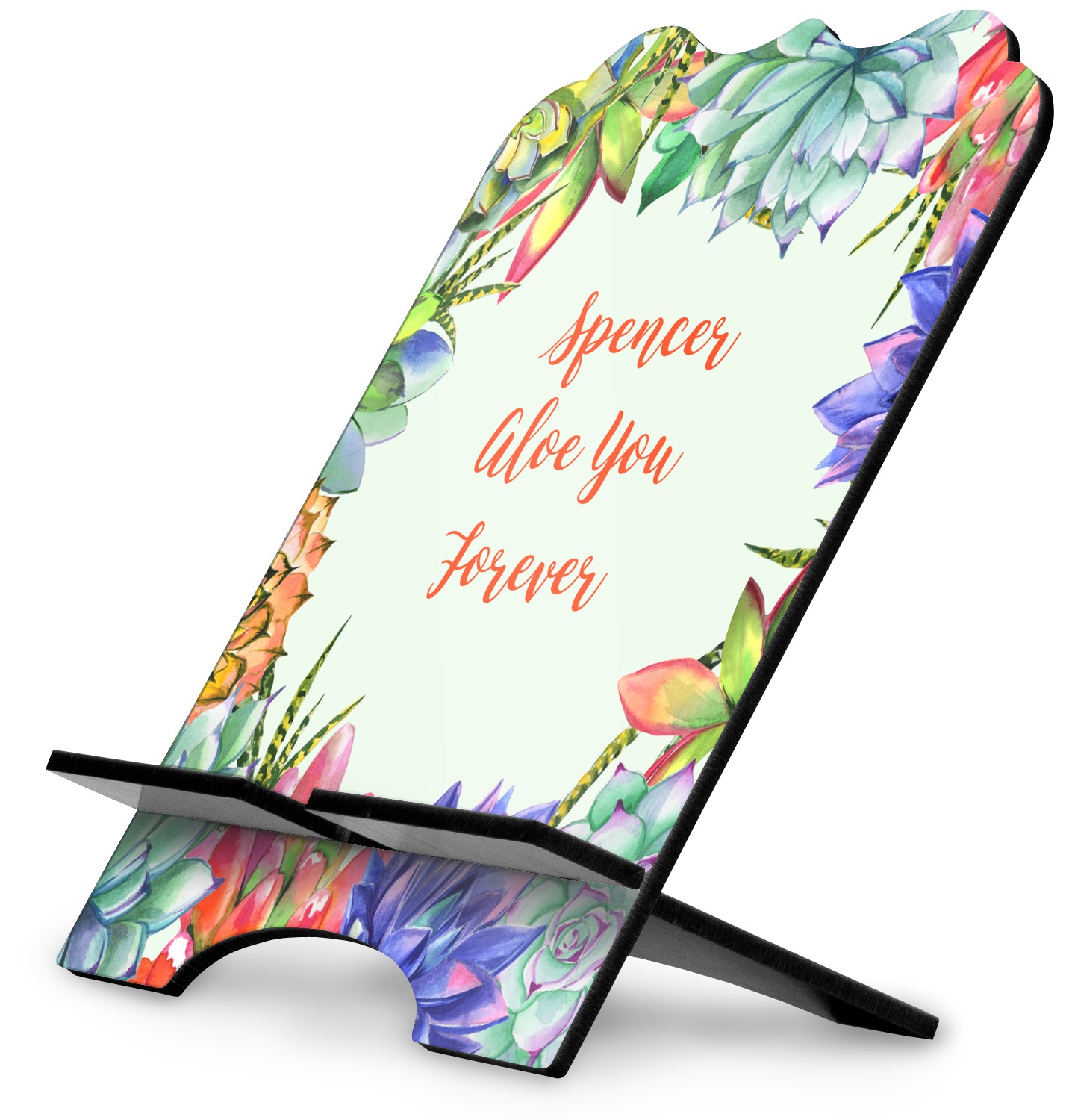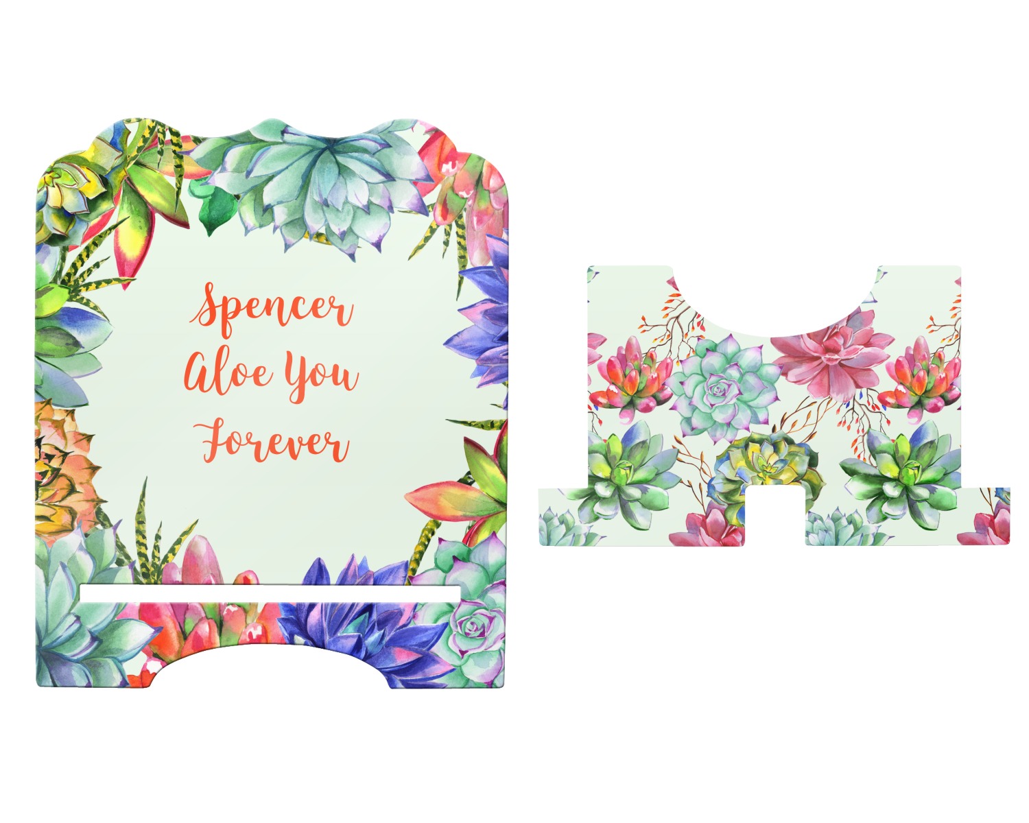 This design is made up of a beautiful frame of succulent illustrations. Because of the nature of the frame, this design will look different on every product. The background is a calming light green. The middle text says "Spencer, Aloe You Forever", which can easily be personalized to your own name or someone else's. You will find orange, green, purple, pink, and orange in this lovely design.
