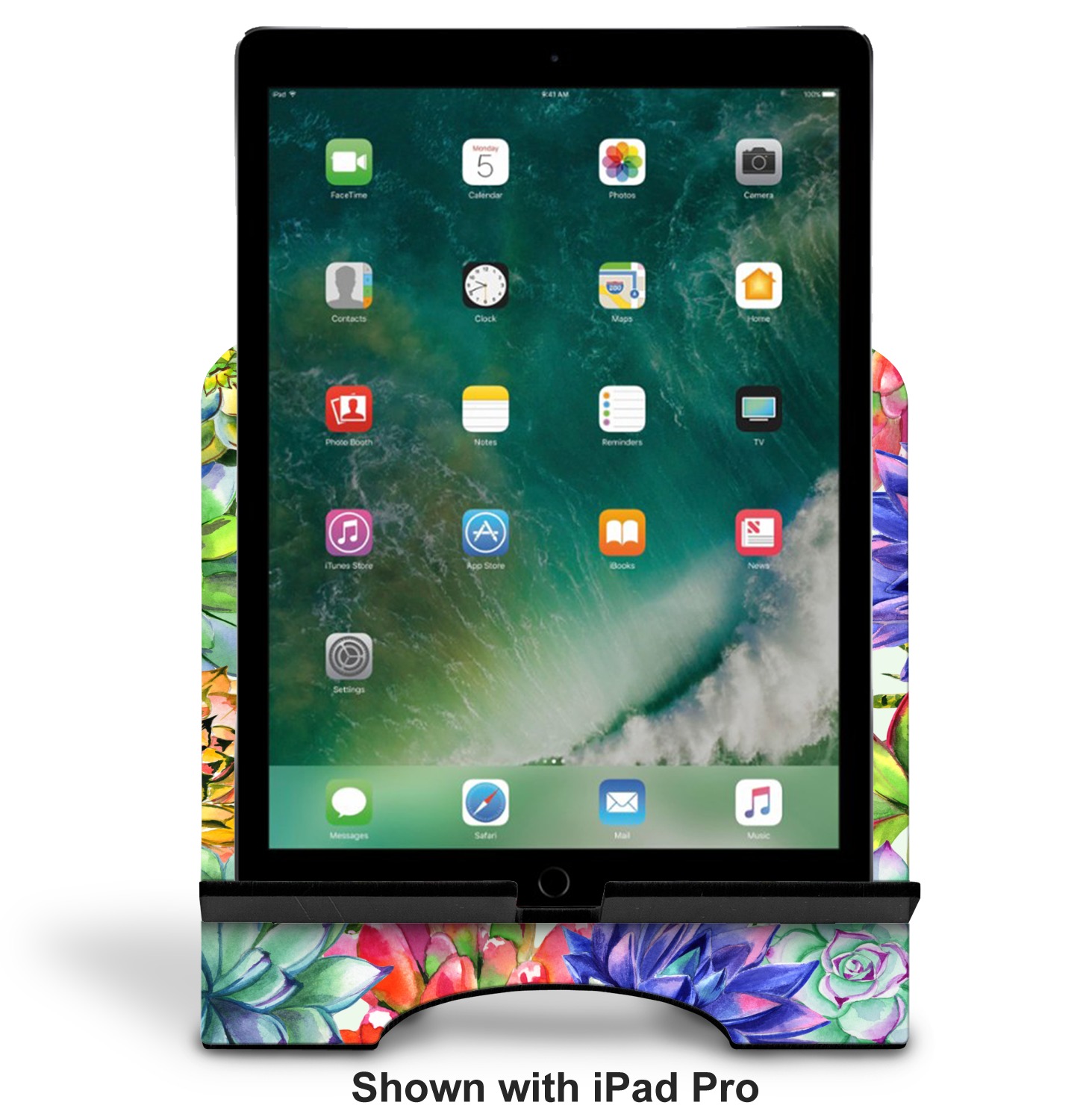 The stand is comprised of two hardboard pieces that fit snugly together and stabilize one another. The bottom part of the iPad stand supports your tablet, and has space for your tablets charger while in use. At 9.25" x 11.5", this tablet mount can support a device between the sizes of the iPad Pro and the iPad Mini 2. The uppermost part of the stand features a decorative, curved edge for a classy, suave appearance. We print your customization atop the face of the stand, in vibrant color. The remaining sides are colored a sleek black.