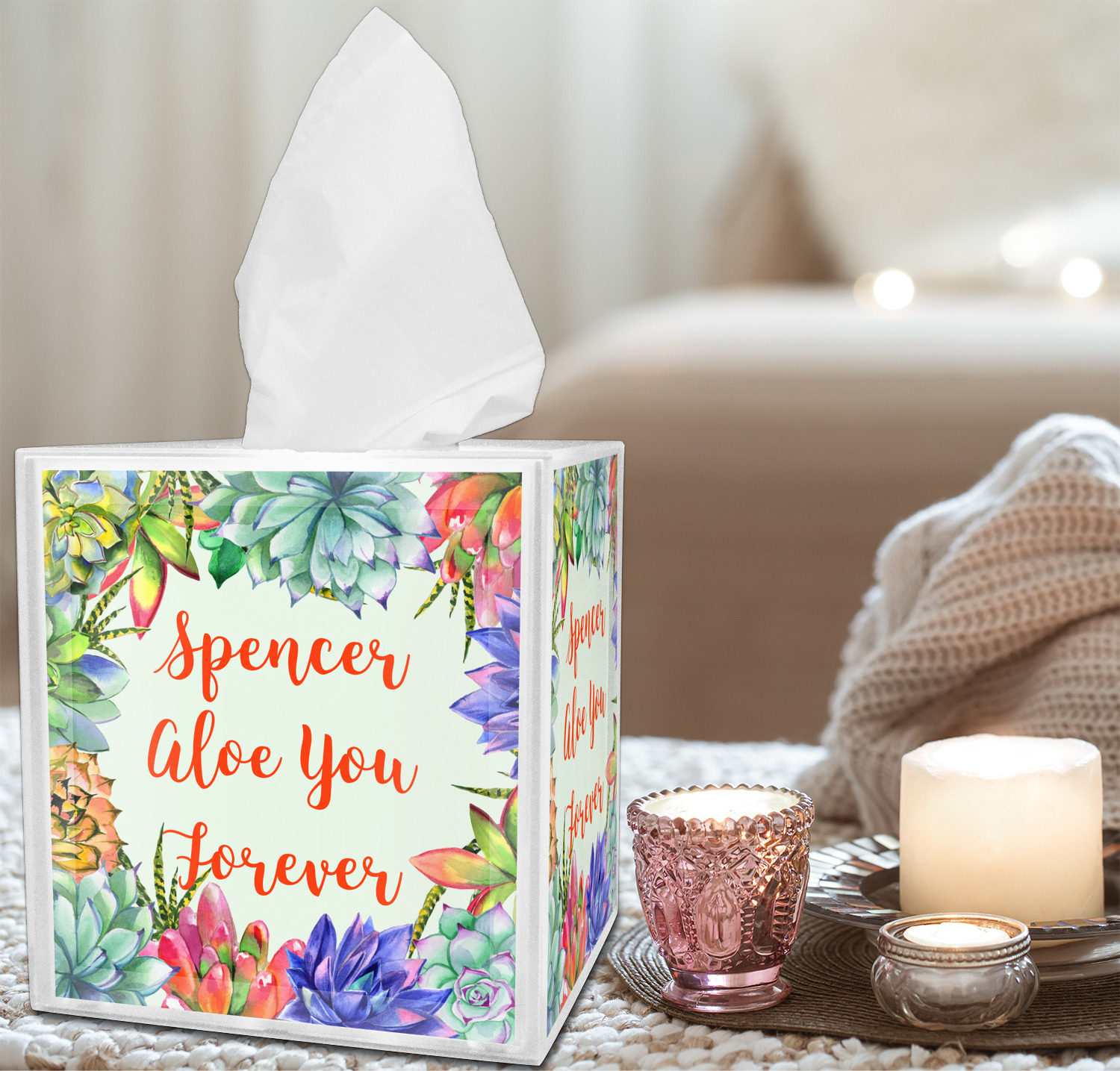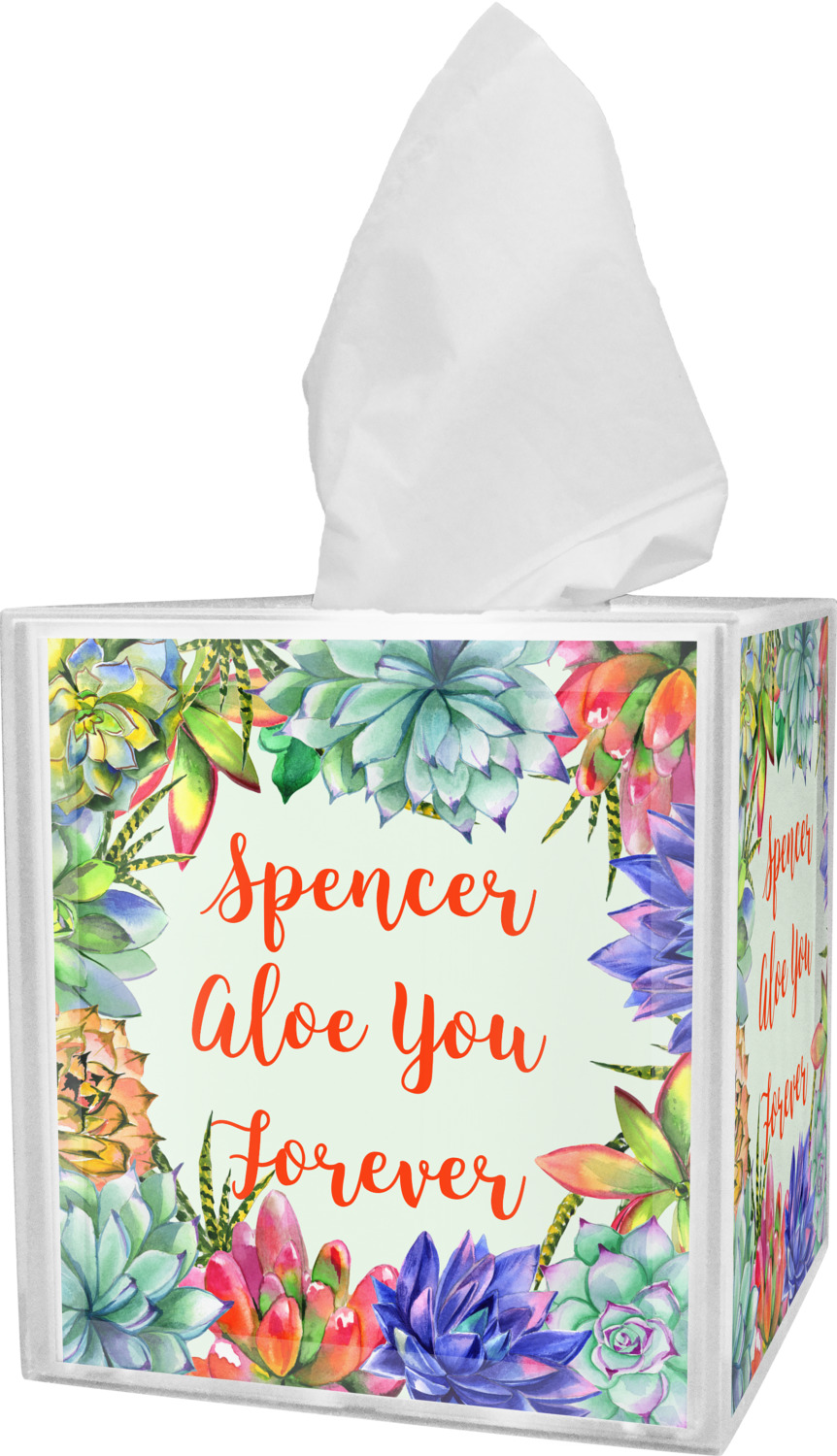 These tissue holders are built from durable acrylic and display your unique personalization on fine-quality vinyl inserts placed within the four sides and top. The box features two pieces, allowing you to easily switch out tissue boxes. On the sides, youll find ridges that ensure the top and base fit securely in place. The bottom of these tissue box holders has four, rubber, non-slip pads to prevent the box from scuffing any surface you decide to display it on. Each box can fit a standard 5 by 5-inch box of tissues.