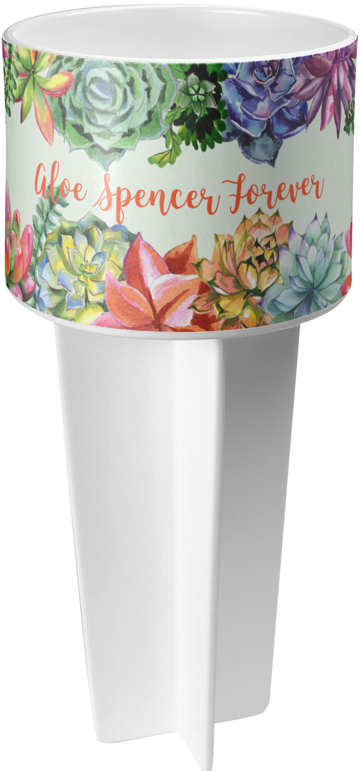 This cup holder has a large stake at its bottom that anchors it to the sand or ground below, while the cup holder rests above the stake. The entire drink holder is made of durable plastic and displays your customization around the cup holder portion. We sell these personalized beach spikers in two different colors: black and white.