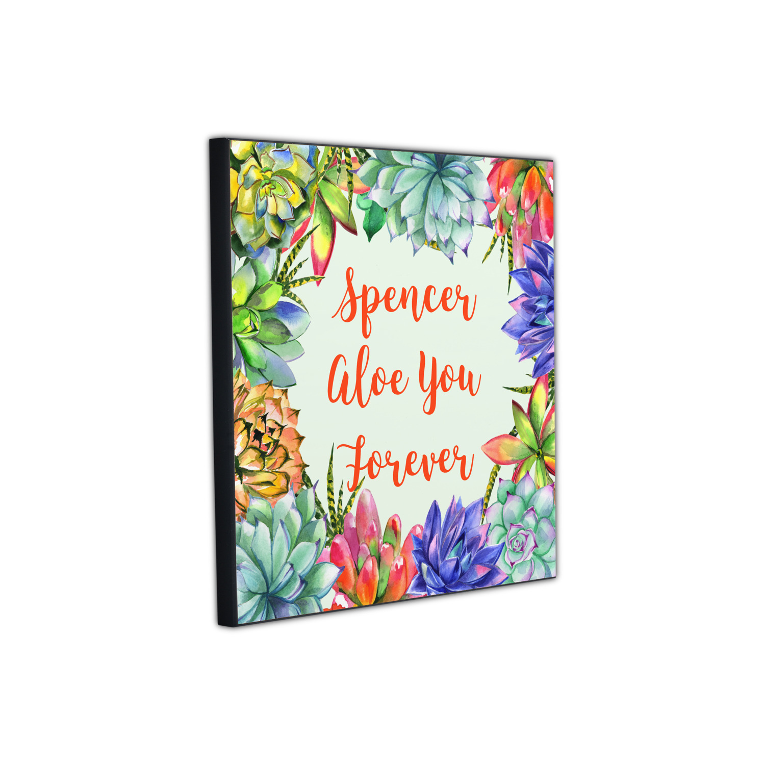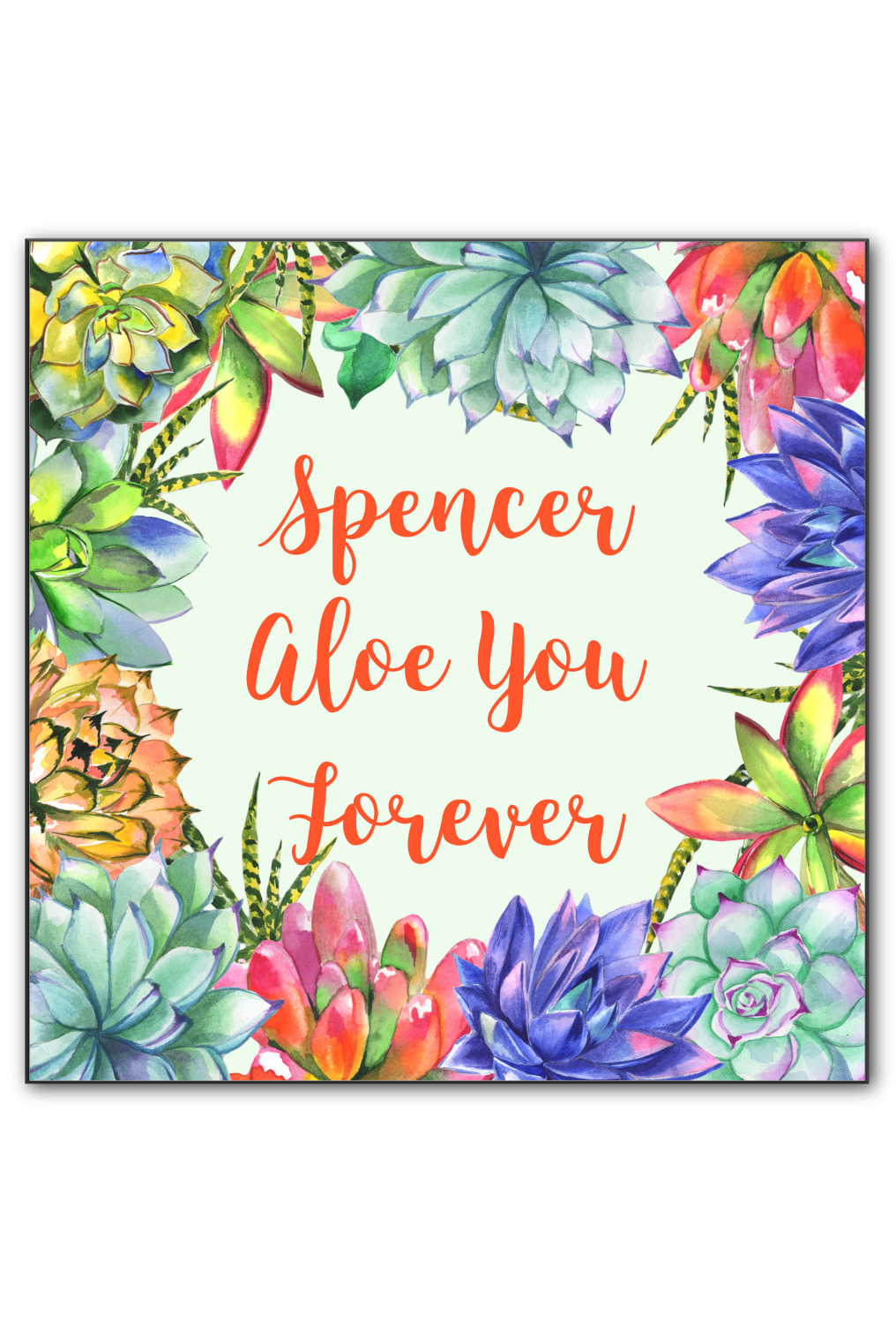 This design is made up of a beautiful frame of succulent illustrations. Because of the nature of the frame, this design will look different on every product. The background is a calming light green. The middle text says "Spencer, Aloe You Forever", which can easily be personalized to your own name or someone else's. You will find orange, green, purple, pink, and orange in this lovely design.