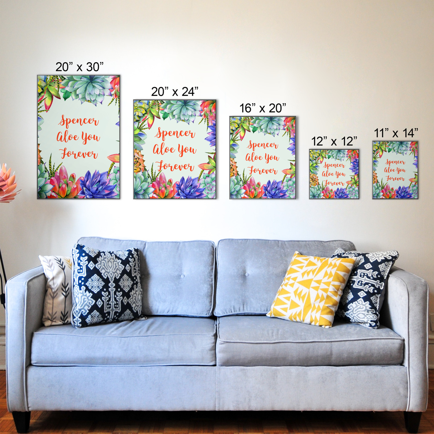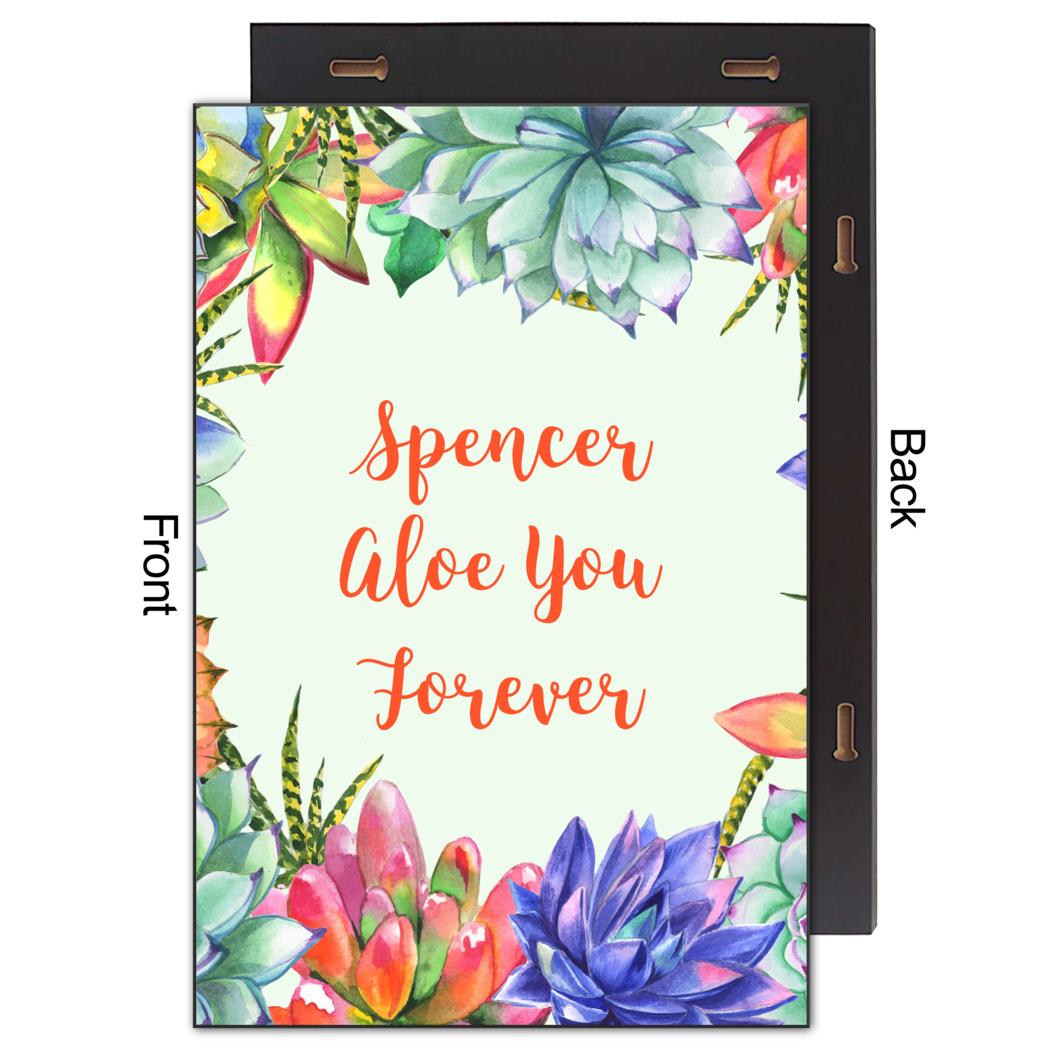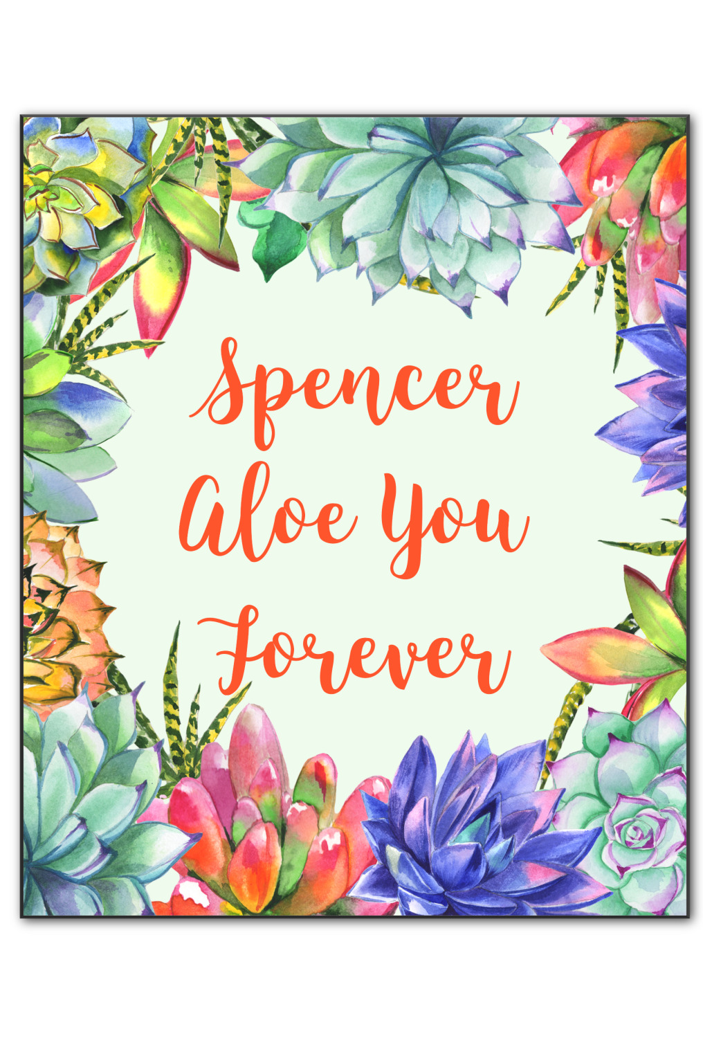 This design is made up of a beautiful frame of succulent illustrations. Because of the nature of the frame, this design will look different on every product. The background is a calming light green. The middle text says "Spencer, Aloe You Forever", which can easily be personalized to your own name or someone else's. You will find orange, green, purple, pink, and orange in this lovely design.