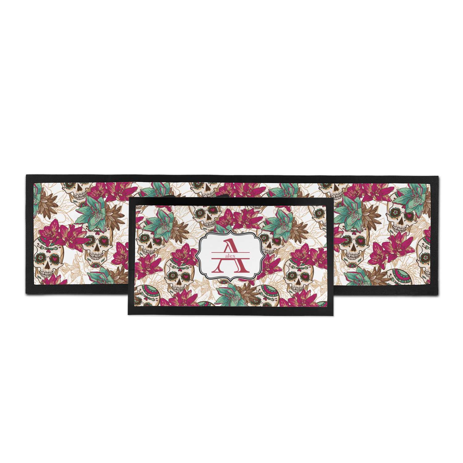 Amidst the flowers and smiling skulls, a label rests in the center, the perfect place for the personalization of your choice.