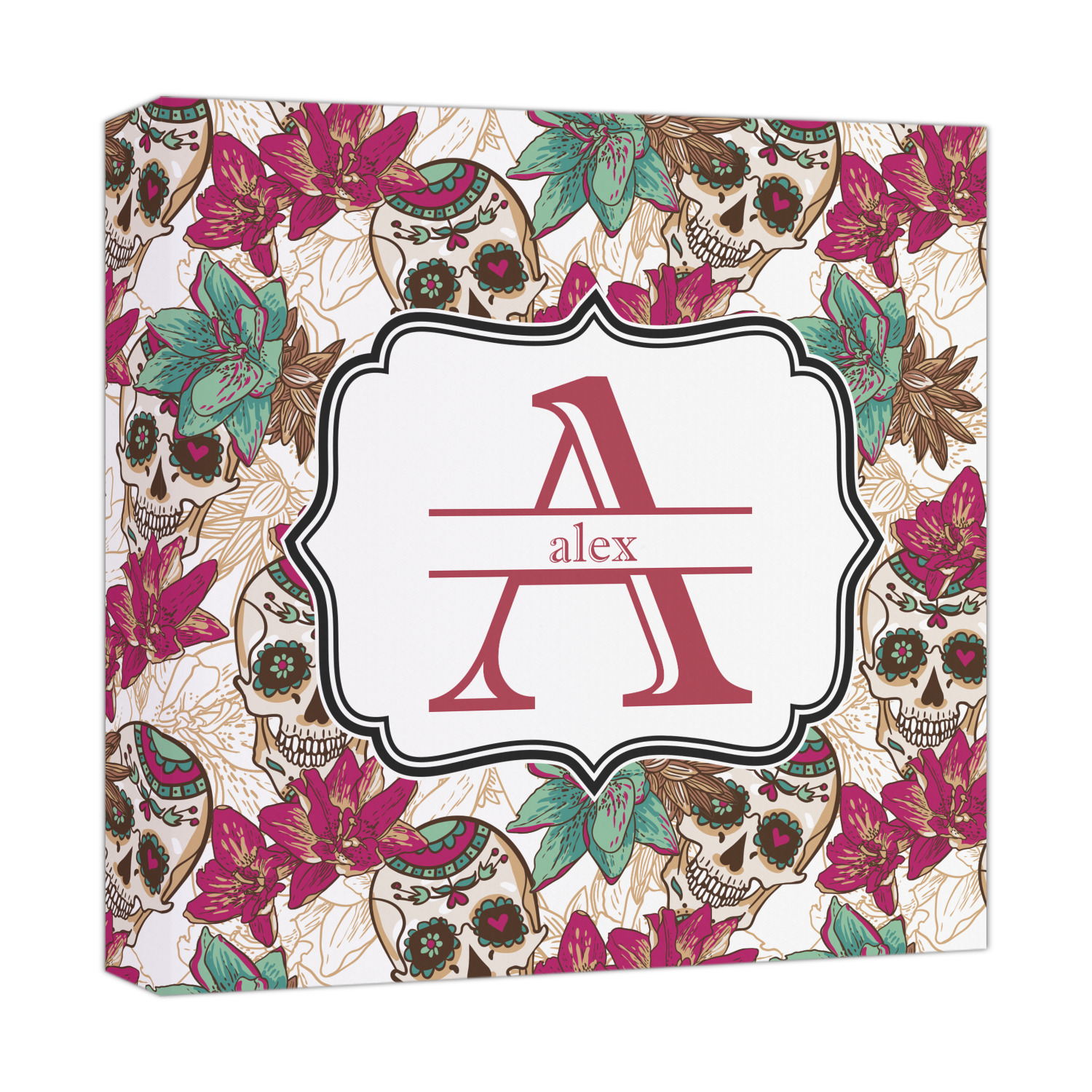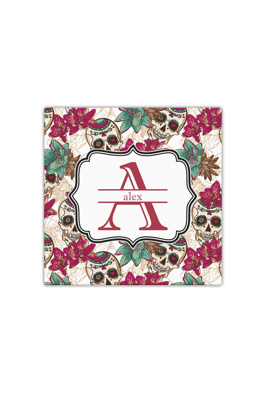 Amidst the flowers and smiling skulls, a label rests in the center, the perfect place for the personalization of your choice.