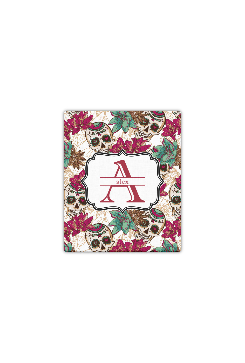This design is full of sugar, spice, and everything nice, featuring the traditional Mexican Sugar Skulls. The calaveras, the official name of the sugar skulls, in this design are whimsical with flowers and hearts in the eye-sockets in lovely teal and magenta colors.