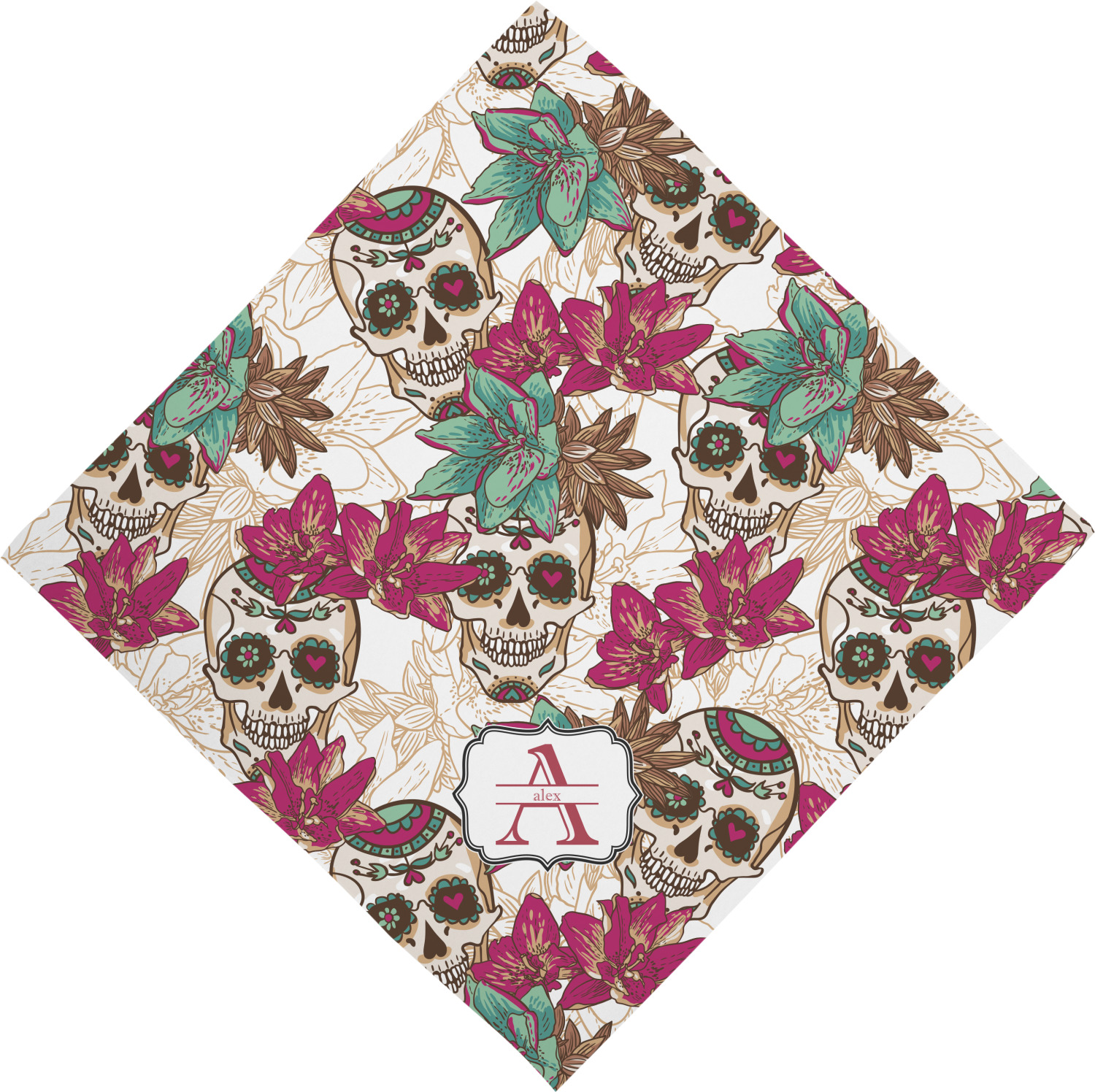 This design is full of sugar, spice, and everything nice, featuring the traditional Mexican Sugar Skulls. The calaveras, the official name of the sugar skulls, in this design are whimsical with flowers and hearts in the eye-sockets in lovely teal and magenta colors.