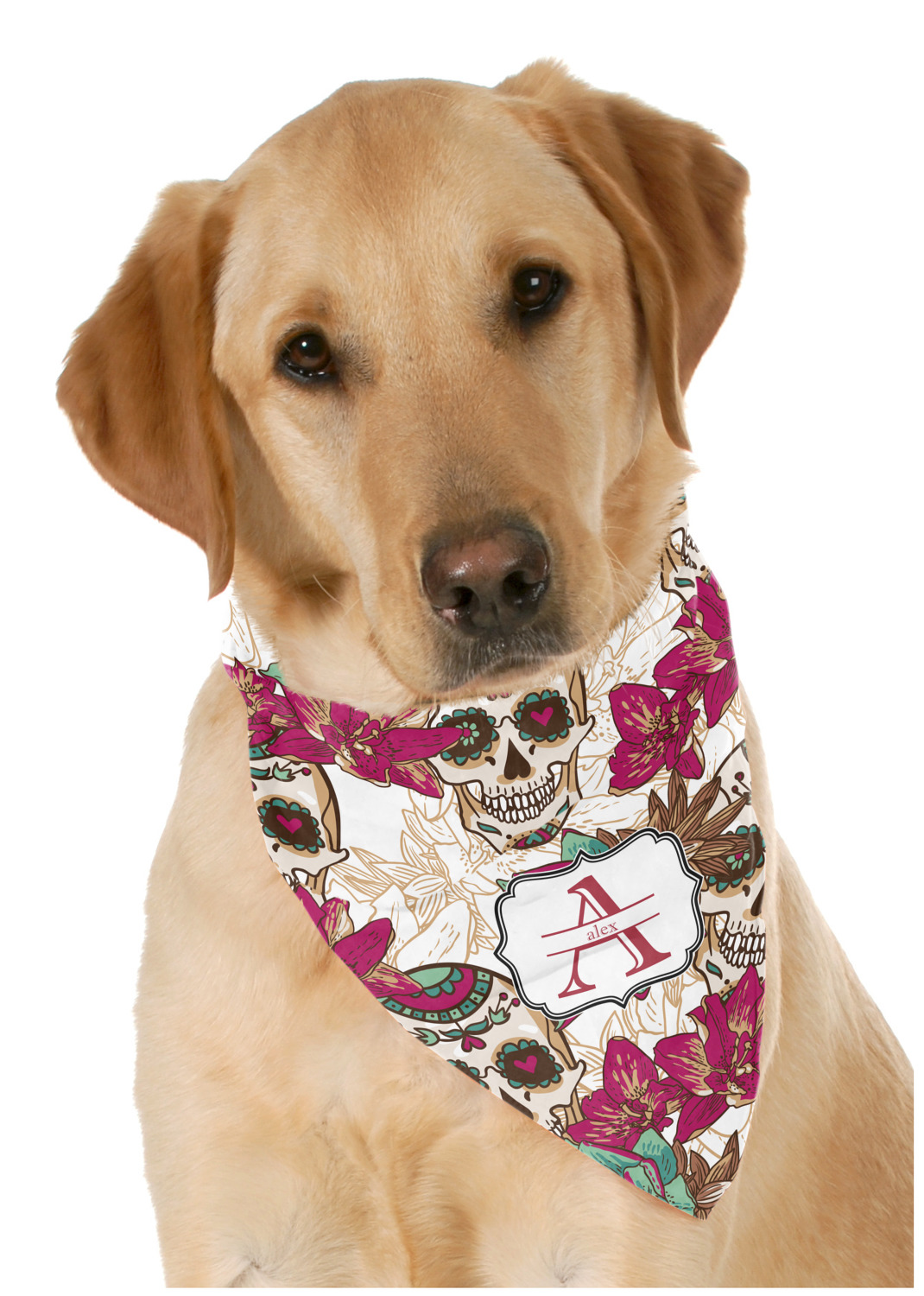 This beautiful pet bandana really is the perfect accessory. It is made from a silky feeling polyester and measures at approximately 23" x 23". Your personalization will be printed on a diagonal, so that you are able to read the personalization when folded into a triangle. This bandana fits best on large dogs, but can be folded smaller if there is no personalized text to fit smaller pets.