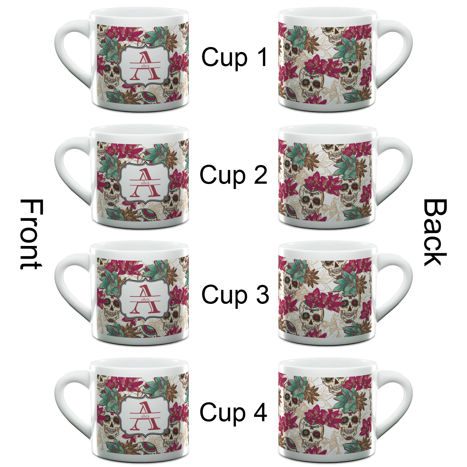 Each of our espresso mugs is a ceramic material sure to keep your drink warm. Personalize one cup for yourself, or order a set of 4! Its the perfect little gift for any coffee lover! We carry two sizes for you to personalize - 3 oz. (approx. 3.25" x 2.325" x 2.625") or 6 oz. (approx. 4" x 2.9" x 2.9"). Our 3 oz. mug is perfect for that single shot espresso while our 6 oz. mug can be your next favorite cappuccino cup holding two shots of espresso!
