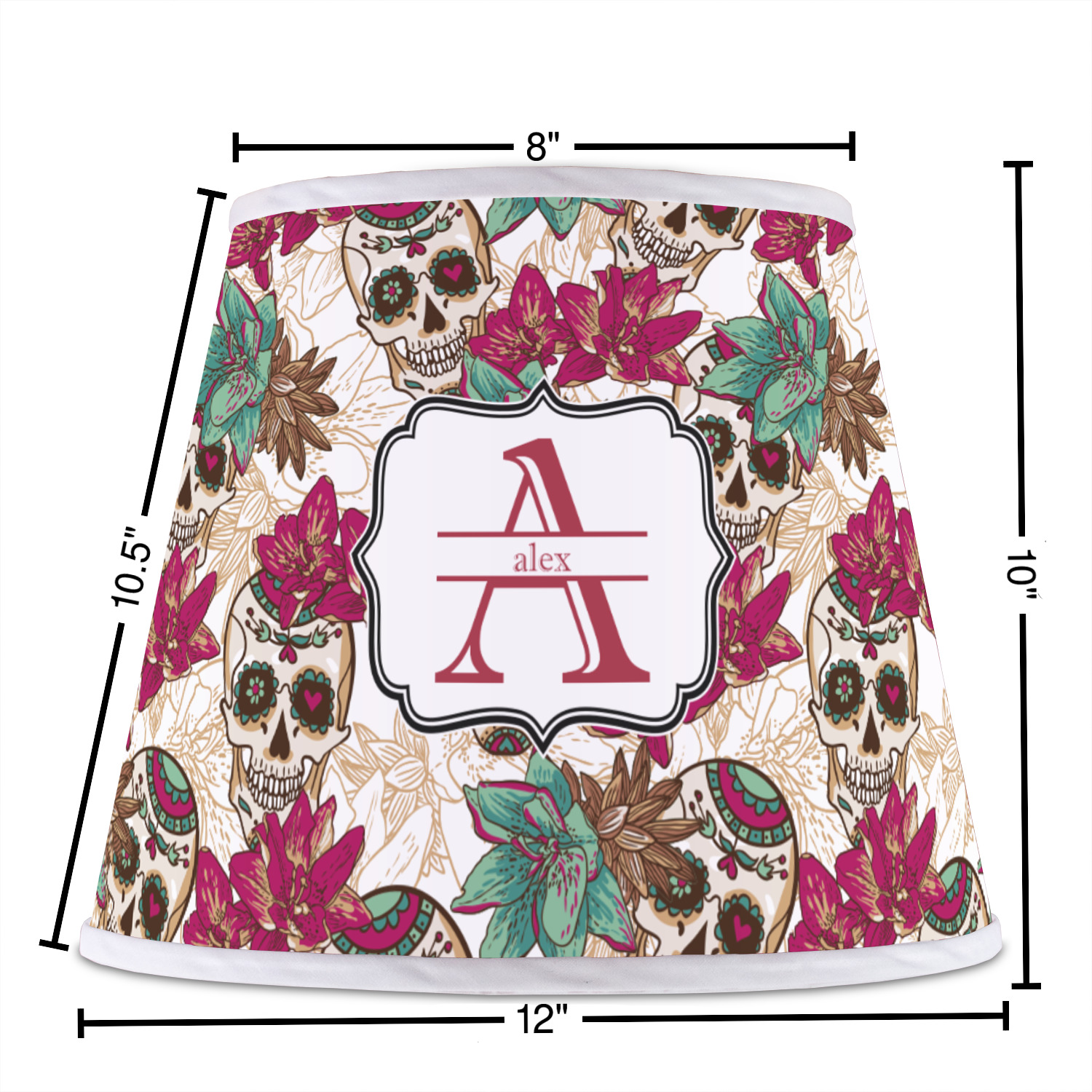The base of this lampshade is 12 inches in diameter, and the top spans 8 inches in diameter. The total height of the lampshade is 10 inches. The angled nature of this custom lampshade concentrates the light, making it ideal for smaller spaces. This lampshade is made of matte, polyfilm, and displays your customization in its middle. The top and bottom of this colorful lamp shade are lined with a white fabric ribbon (which can be replaced with black inside the design studio) which frames your design and creates a sophisticated finish. As an UNO fitter lampshade, this unique lamp shade will fit a variety of bases.