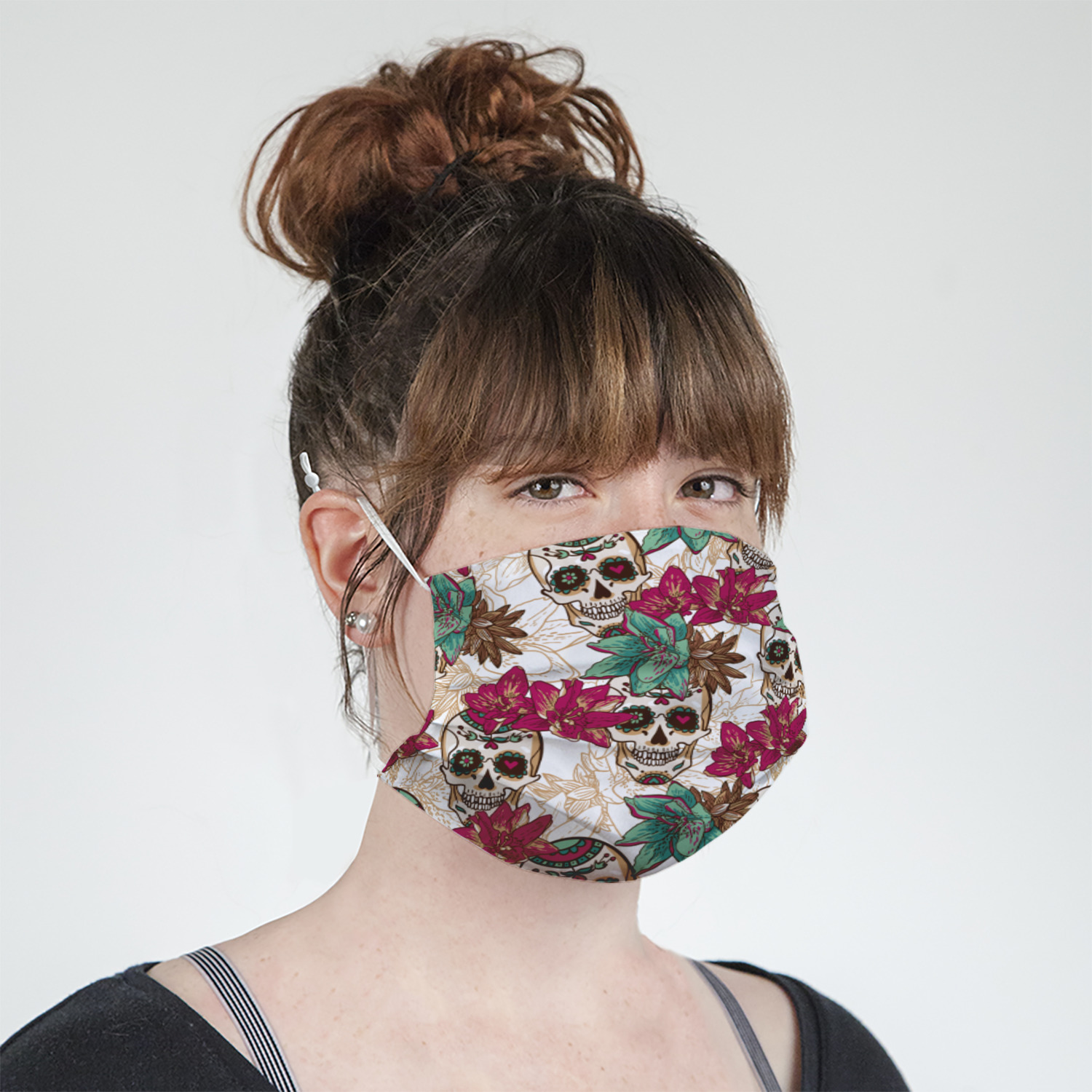 These fun face masks are 7" wide and 3.5" high. They feature pleats, adjustable ear loops, and are made with two layers of fabric. The top layer where your design is printed is a breathable polyester sheeting, while the inside layer is a soft microfiber polyester