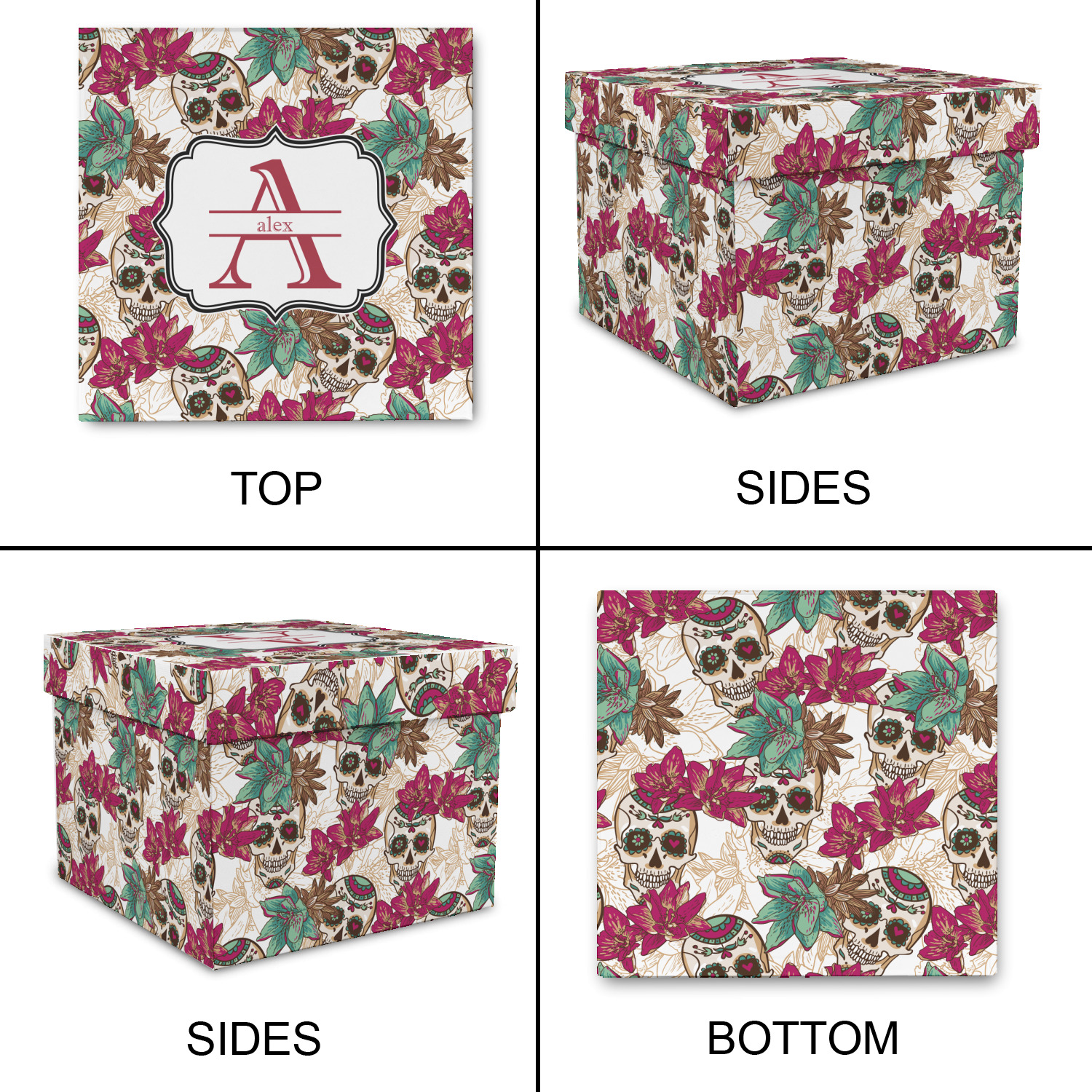 Amidst the flowers and smiling skulls, a label rests in the center, the perfect place for the personalization of your choice.