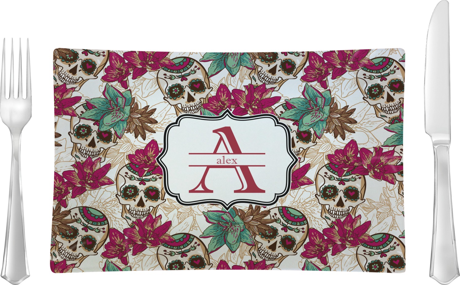 Amidst the flowers and smiling skulls, a label rests in the center, the perfect place for the personalization of your choice.