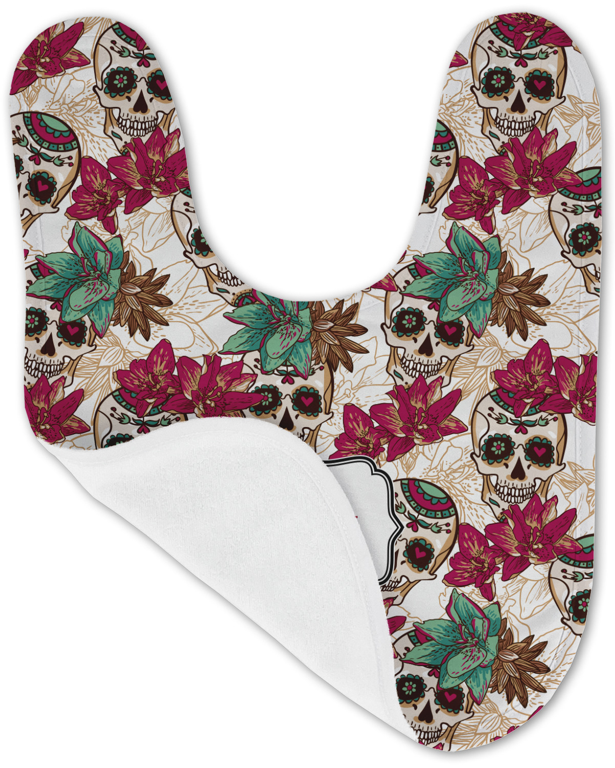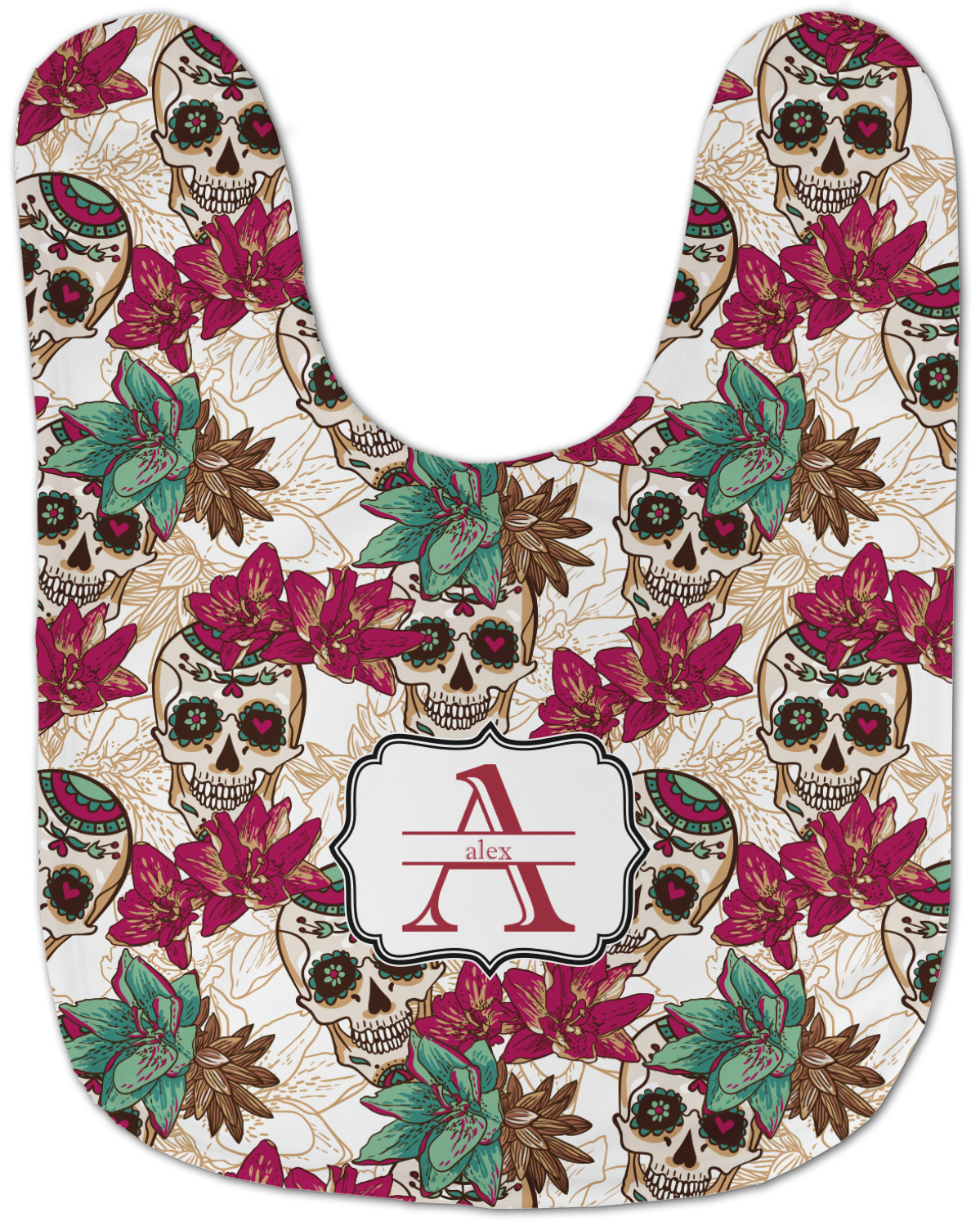 Amidst the flowers and smiling skulls, a label rests in the center, the perfect place for the personalization of your choice.