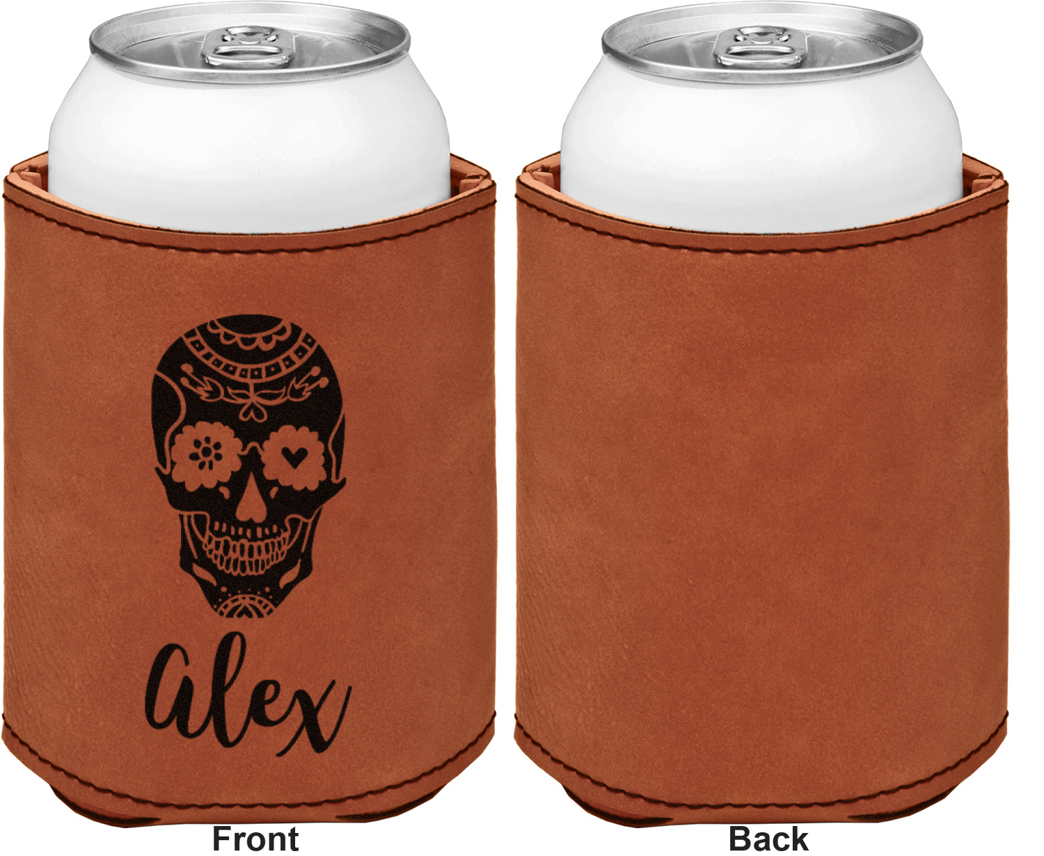 This can sleeve is made from a cognac-brown leatherette and stitched with a sturdy, black thread. A slim padding lines the inside of your can sleeve to allow for a better fit once your drink is inserted. The sleeve itself measures at 4 by 4.5 inches, allowing this custom can sleeve to accommodate most canned drinks. Your personalized design can be engraved on the front and back, or solely the front. When laser-engraved, your design appears as a black coloration which contrasts the leatherette nicely.