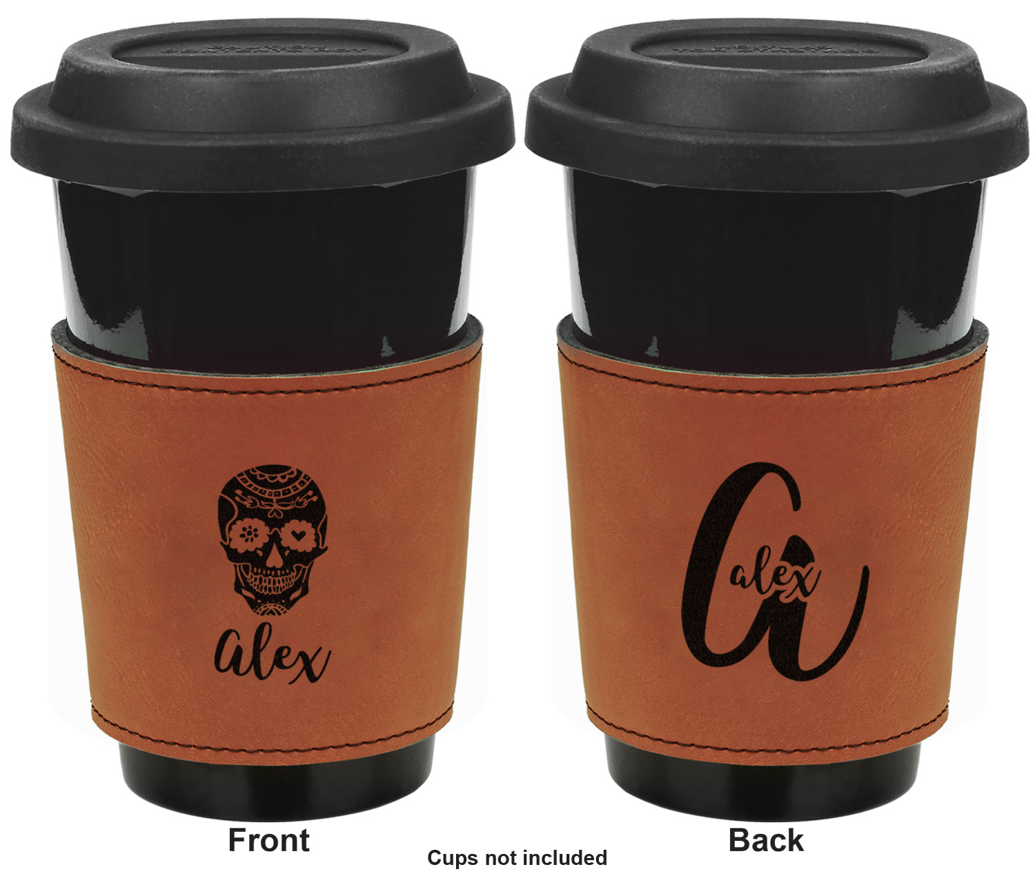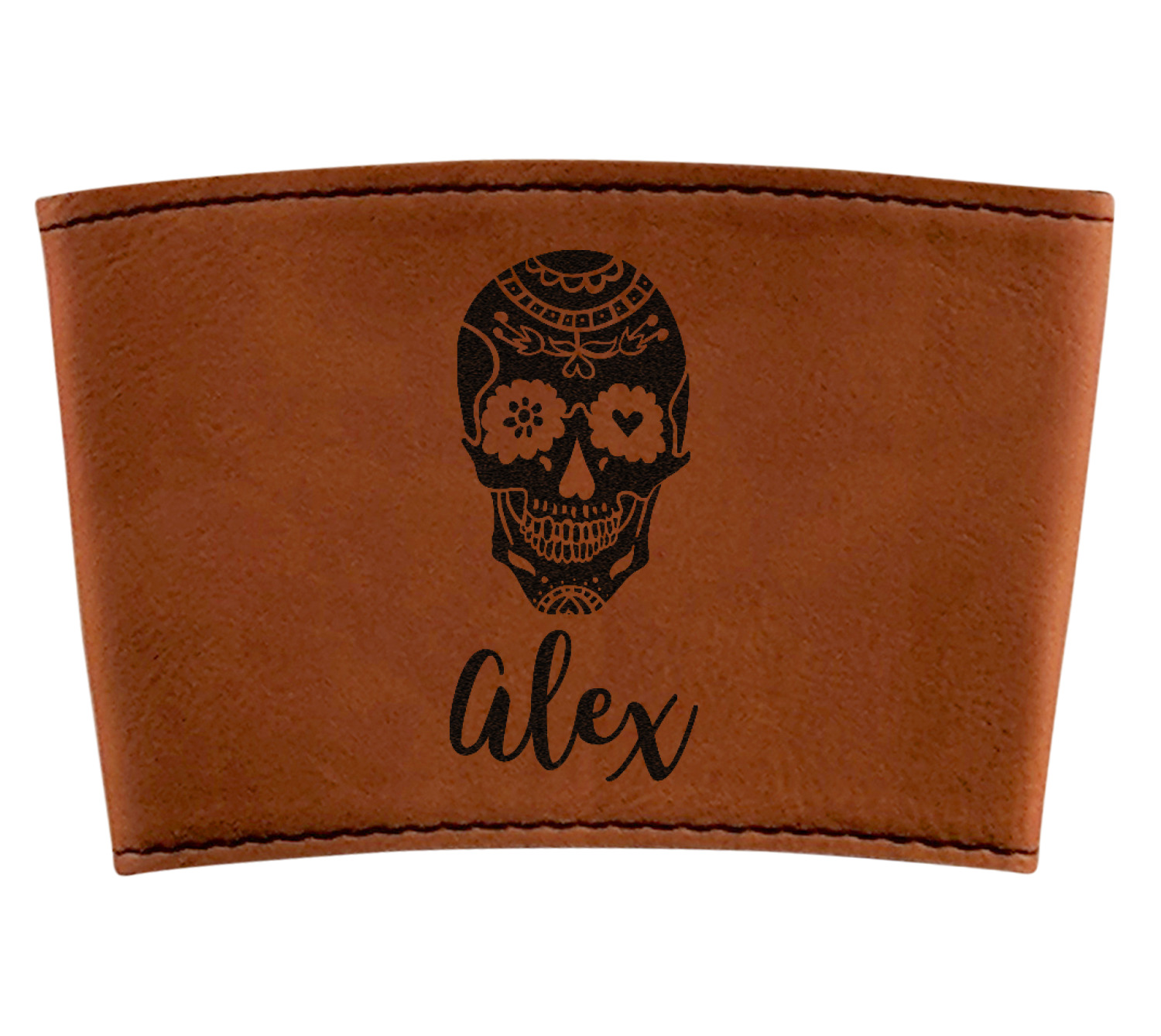This cup sleeve is made from a suave, cognac-brown leatherette and finished with an intricate, black stitch. The interior of this can sleeve is fabricated from a thin foam material to help insulate your mug's contents. The sleeve is specifically made to suit tapered glasses or mugs, so the top's diameter is 3.5 inches, while the bottom's diameter is 2.75 inches. Your customized design will be laser engraved into the leatherette, leaving behind crisp, black imprint. With these products, we provide you with the option of engraving the front and back, or the front only.