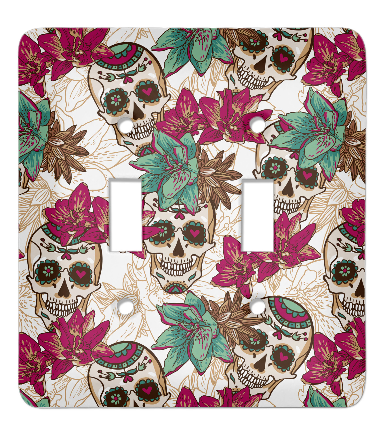This design is full of sugar, spice, and everything nice, featuring the traditional Mexican Sugar Skulls. The calaveras, the official name of the sugar skulls, in this design are whimsical with flowers and hearts in the eye-sockets in lovely teal and magenta colors.