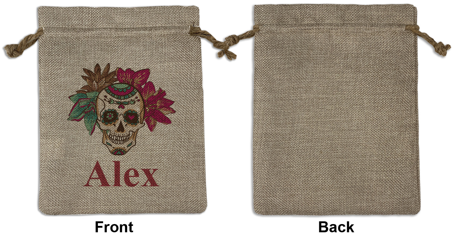 We sell our Burlap Gift Bags in 3 variant sized bags. Made with burlap polyester, each personalized bag can be secured with a twine drawstring pull. Your custom design is available to print on one side or both sides - completely up to you! The sizes of the bags measure approximately 4.5" x 6.5" for the smallest size, 6.5" x 8.0" for the medium size, and 6.5" x 13.5" for the large-sized bag.