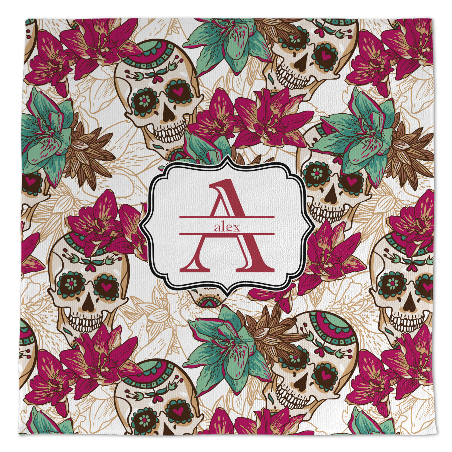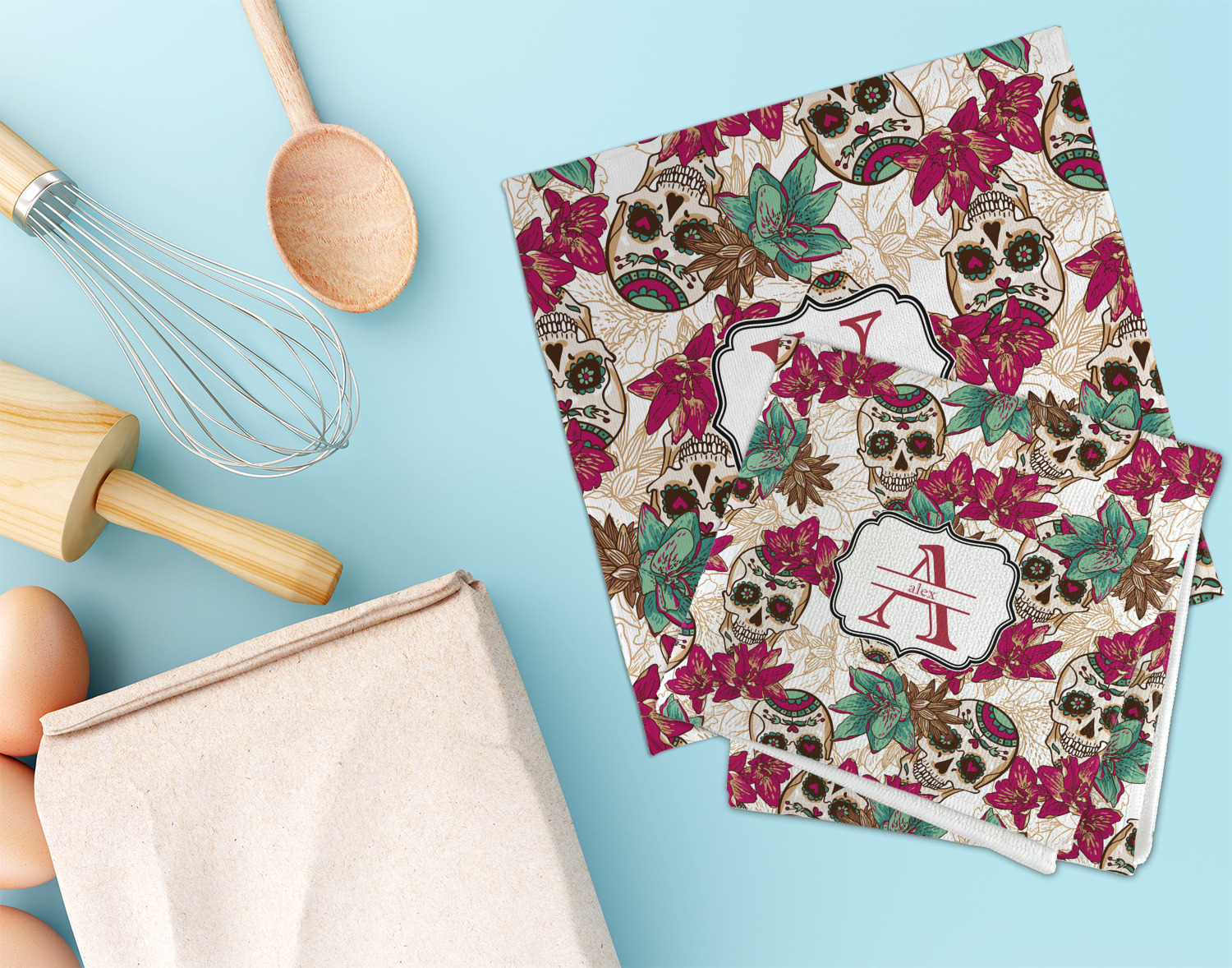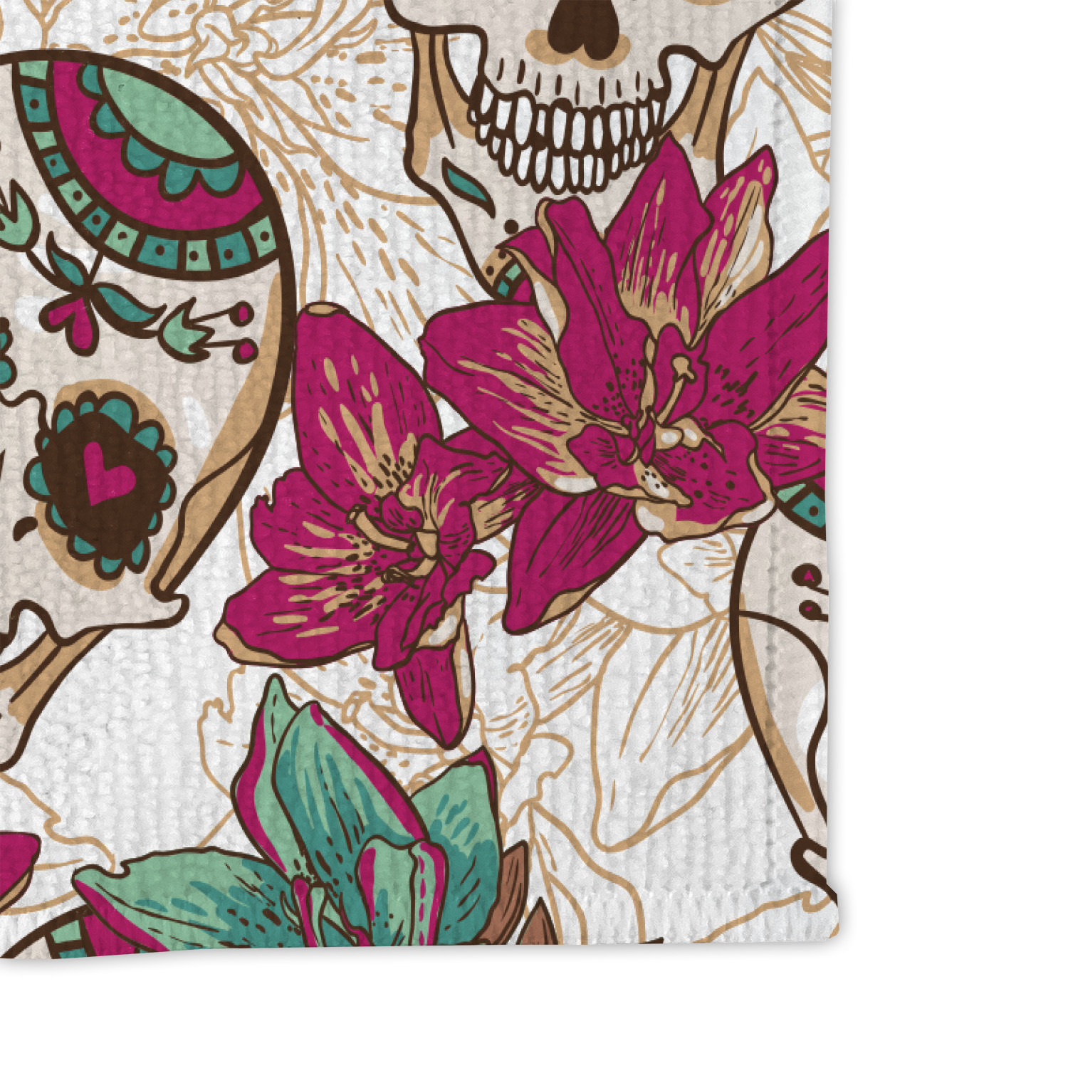 This design is full of sugar, spice, and everything nice, featuring the traditional Mexican Sugar Skulls. The calaveras, the official name of the sugar skulls, in this design are whimsical with flowers and hearts in the eye-sockets in lovely teal and magenta colors.