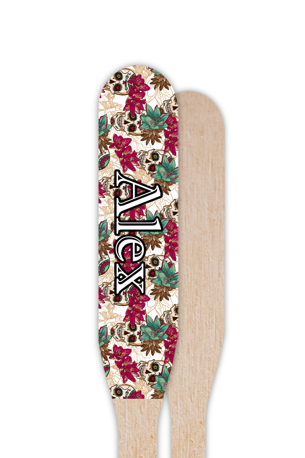 Amidst the flowers and smiling skulls, a label rests in the center, the perfect place for the personalization of your choice.