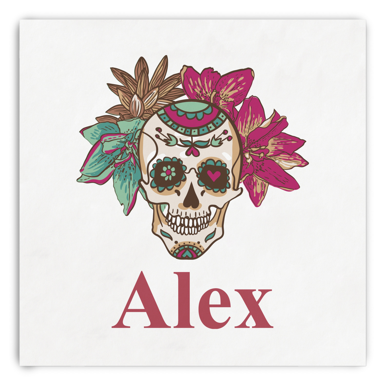 This design is full of sugar, spice, and everything nice, featuring the traditional Mexican Sugar Skulls. The calaveras, the official name of the sugar skulls, in this design are whimsical with flowers and hearts in the eye-sockets in lovely teal and magenta colors.