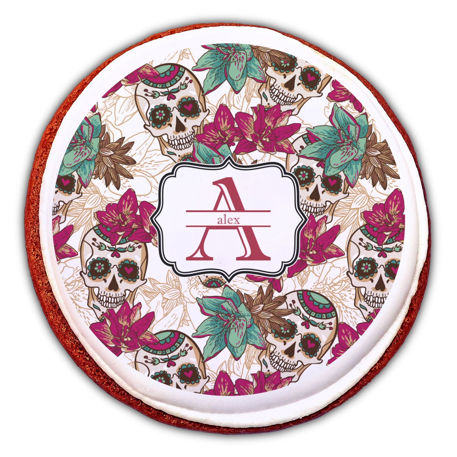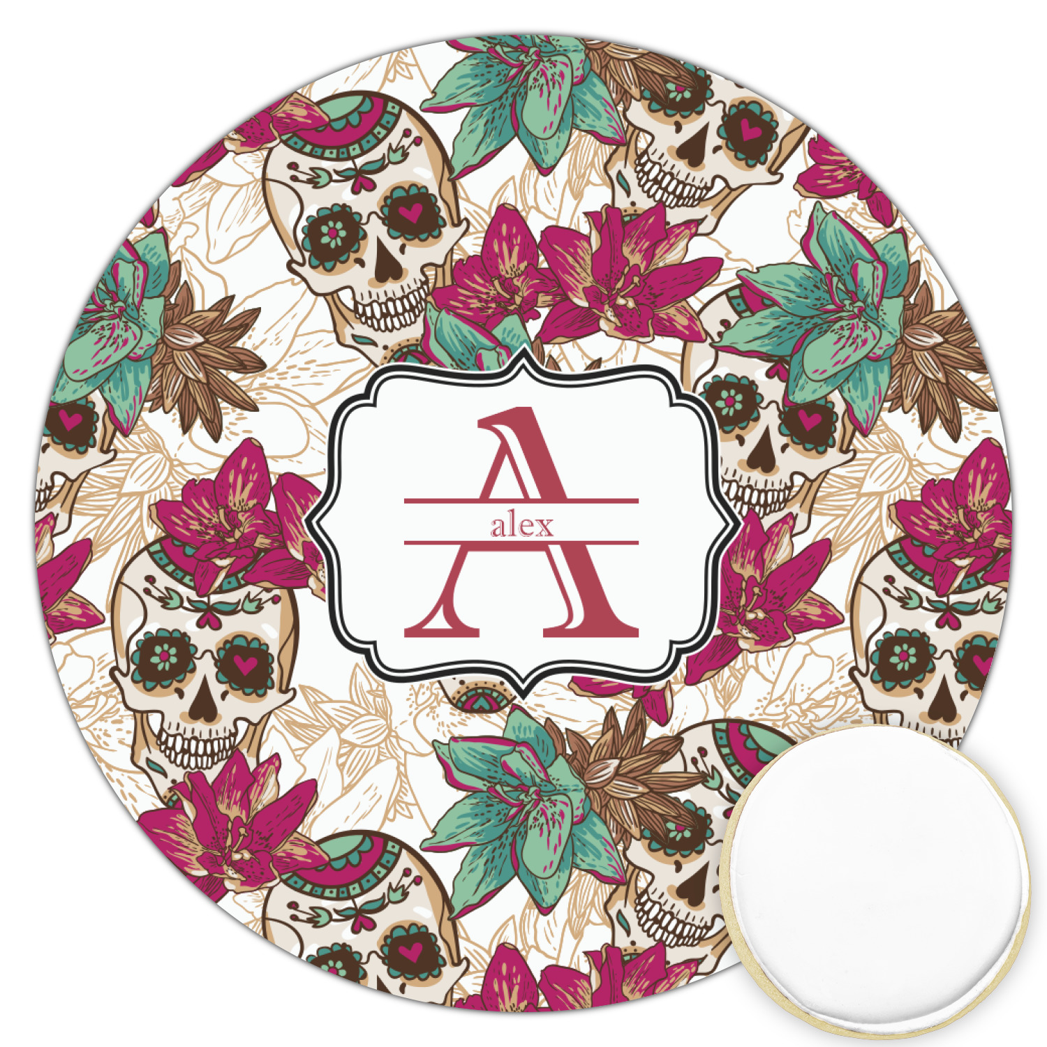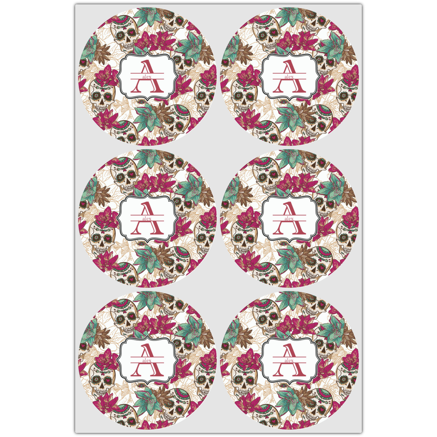 Amidst the flowers and smiling skulls, a label rests in the center, the perfect place for the personalization of your choice.