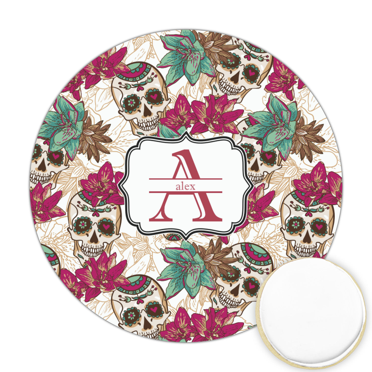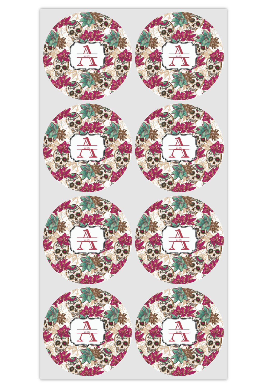 Amidst the flowers and smiling skulls, a label rests in the center, the perfect place for the personalization of your choice.
