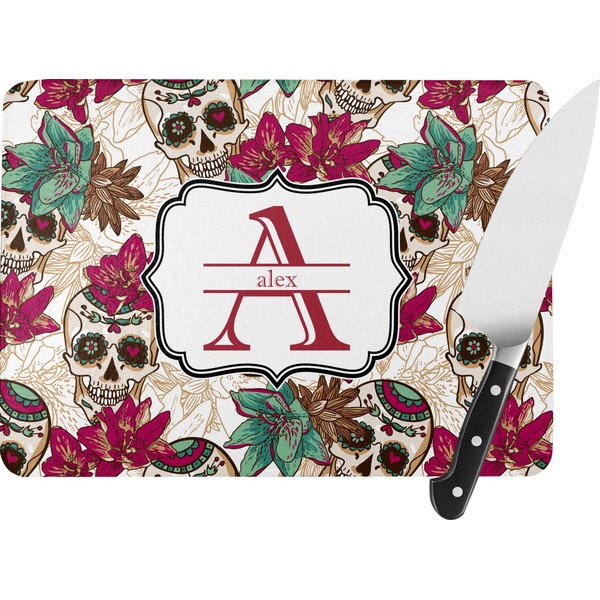 Amidst the flowers and smiling skulls, a label rests in the center, the perfect place for the personalization of your choice.