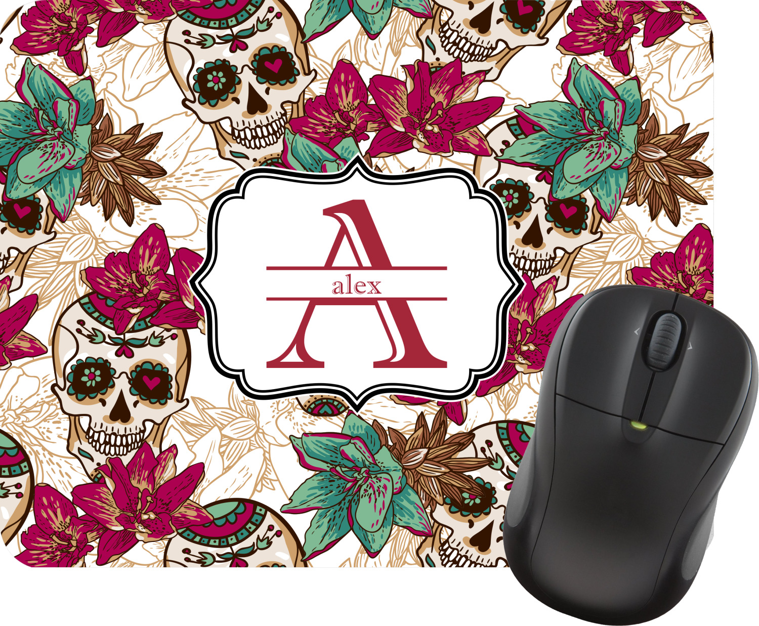 Amidst the flowers and smiling skulls, a label rests in the center, the perfect place for the personalization of your choice.