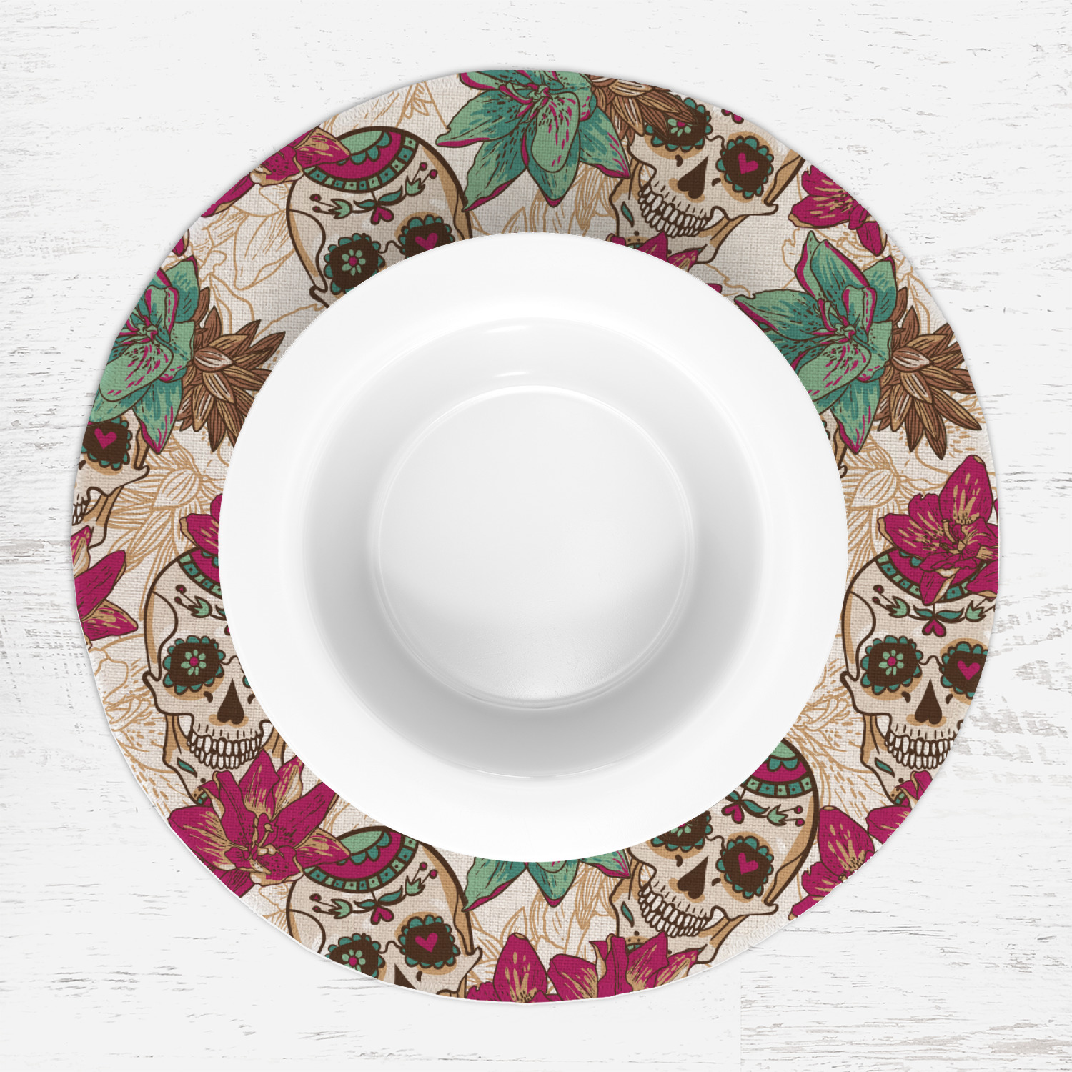 This design is full of sugar, spice, and everything nice, featuring the traditional Mexican Sugar Skulls. The calaveras, the official name of the sugar skulls, in this design are whimsical with flowers and hearts in the eye-sockets in lovely teal and magenta colors.