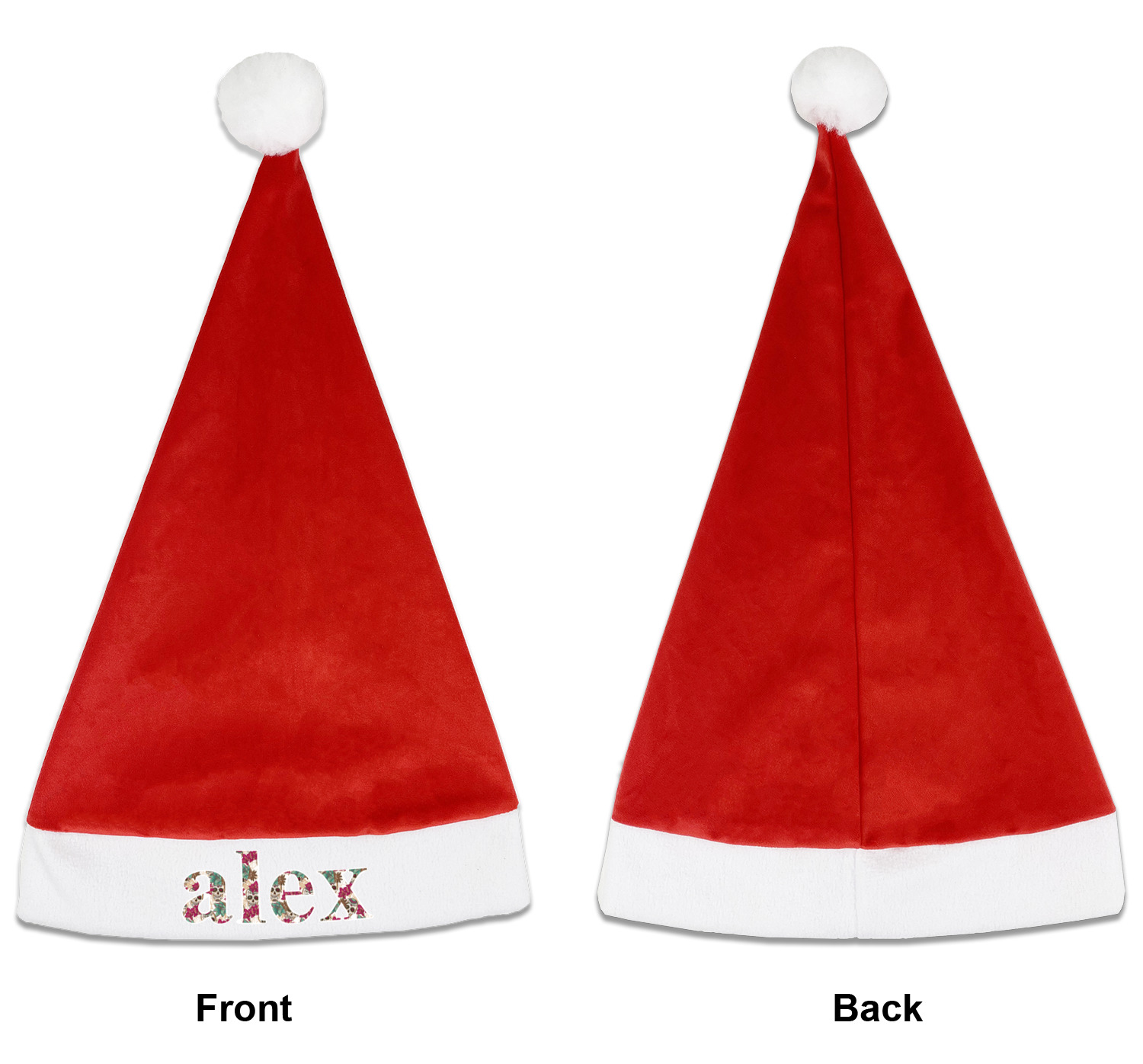 Our Santa hats are a soft, velvety polyester material. These customizable Santa hats are a classic red with white brimming and pom pom ball hanging off the hat tail just like Santa Claus! Each personalized Santa hat is approximately 17.5 L x 11.8 W. We offer two different styles to print your designs on the white brim - front or front & back.