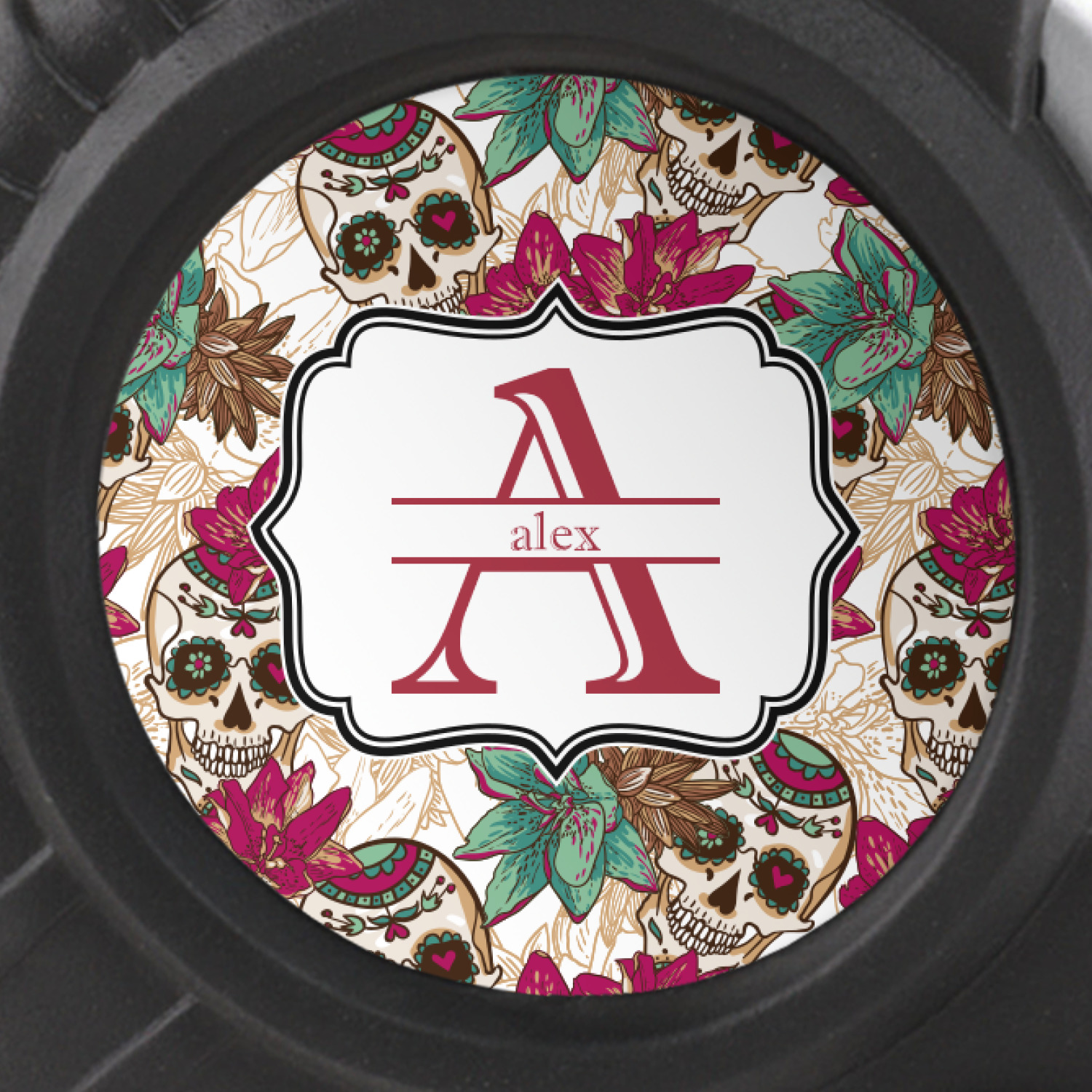 Amidst the flowers and smiling skulls, a label rests in the center, the perfect place for the personalization of your choice.