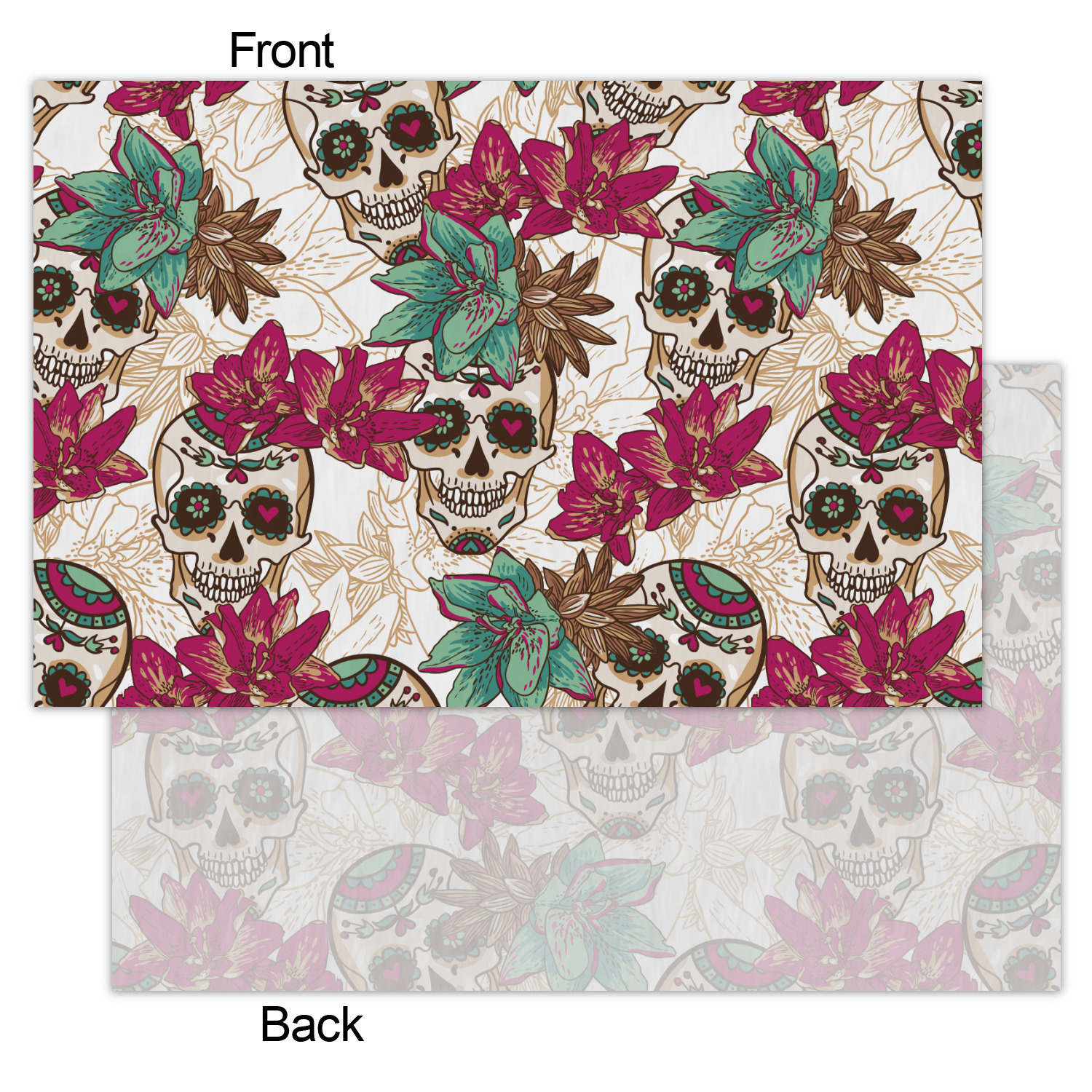This design is full of sugar, spice, and everything nice, featuring the traditional Mexican Sugar Skulls. The calaveras, the official name of the sugar skulls, in this design are whimsical with flowers and hearts in the eye-sockets in lovely teal and magenta colors.