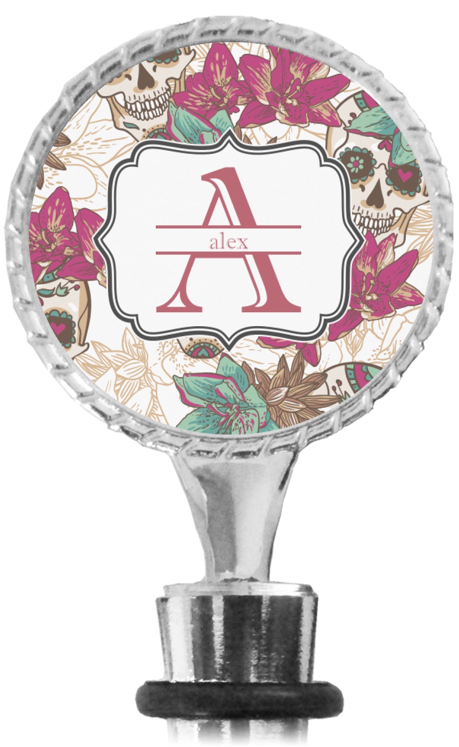 The top part of your bottle stopper is comprised of a zinc ring that displays your customization(s) in its middle, on both sides. The ring is heavy duty, with a bright chrome finish. The body of the wine stoppers have two silicone rings to provide an airtight seal. These wine bottle stoppers measure at 1.625" L x 0.8125" W x 4.625" H; your custom wine stopper is meant to fit into most standard-sized wine bottles.